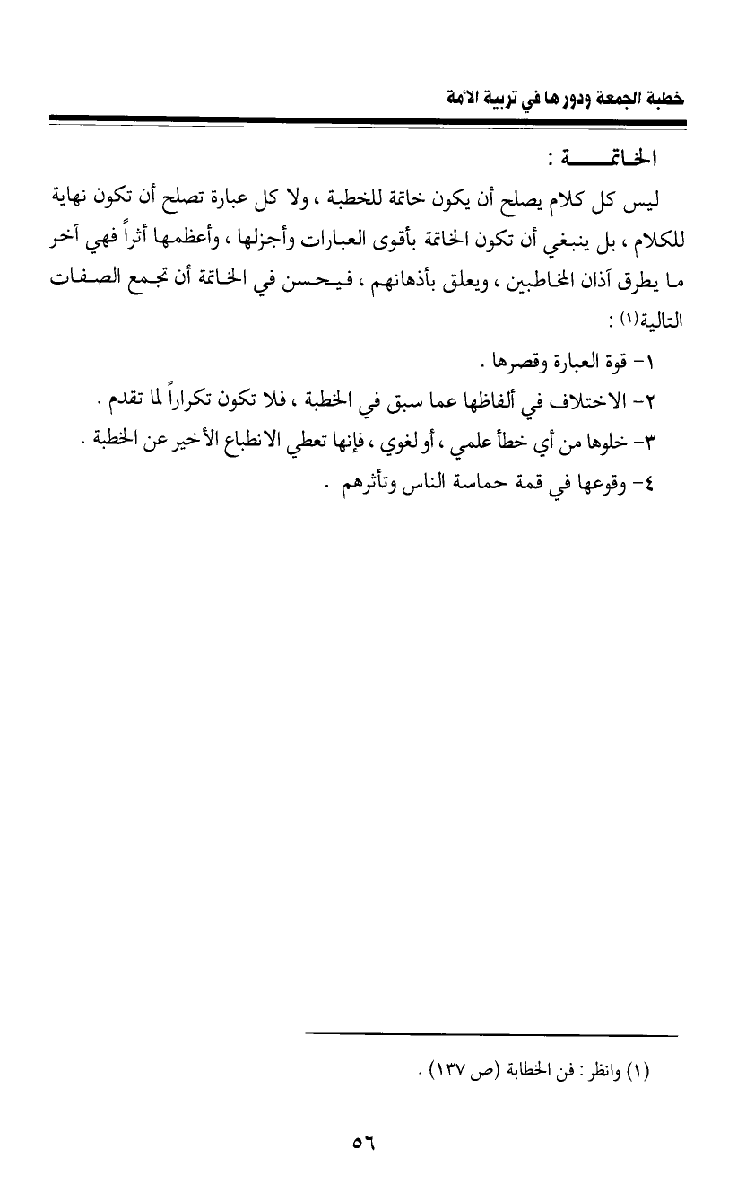 الخاتمة: ليس كل كلام يصلح أن يكون خاتمة للخطبة، ولا كل عبارة تصلح أن تكون نهاية للكلام، بل ينبغي أن تكون الخاتمة بأقوى العبارات وأجزلها، وأعظمها أثرا فهي آخر ما يطرق آذان المخاطبين، ويعلق بأذهانهم، فيحسن في الخاتمة أن تجمع الصفات التالية (¬1) .