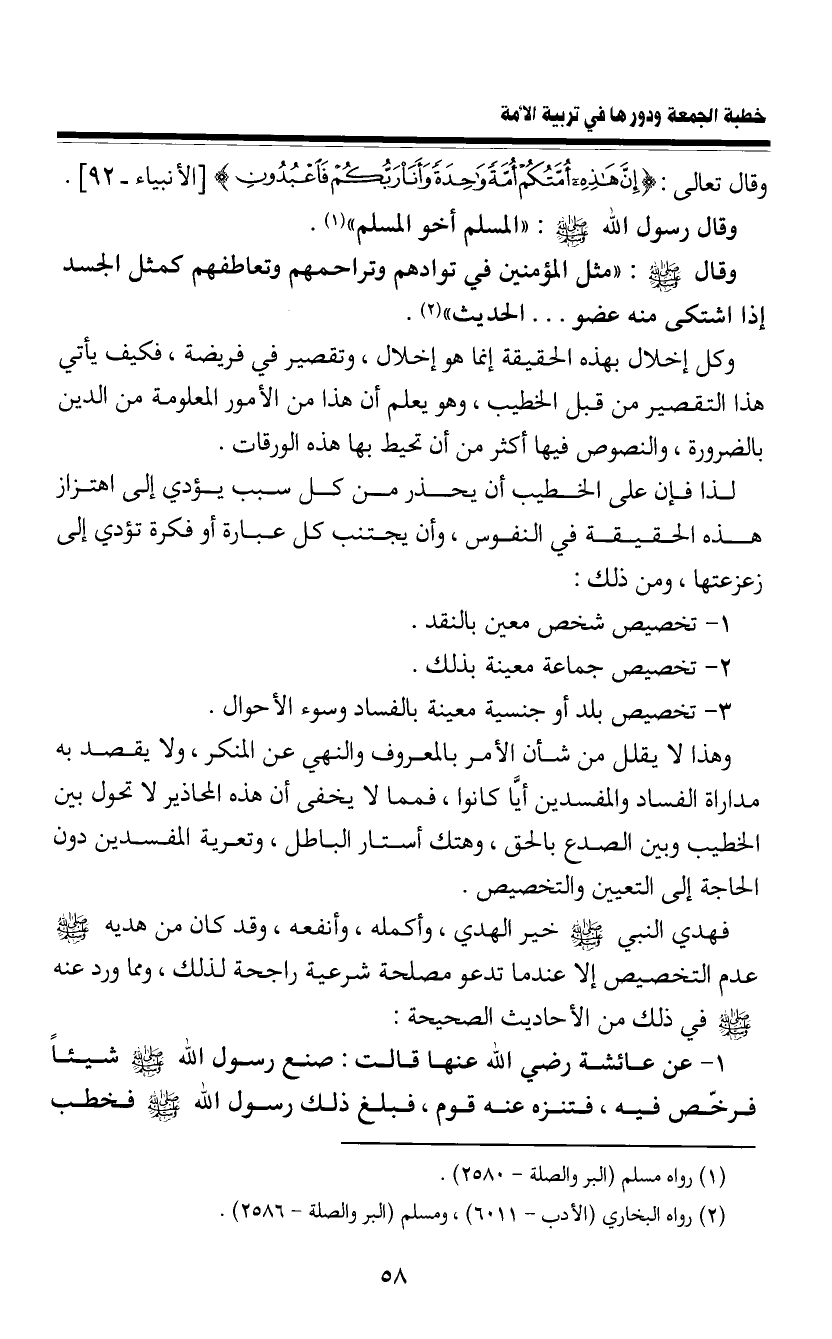 وكل إخلال بهذه الحقيقة إنما هو إخلال، وتقصير في فريضة، فكيف يأتي هذا التقصير من قبل الخطيب، وهو يعلم أن هذا من الأمور المعلومة من الدين بالضرورة، والنصوص فيها أكثر من أن تحيط بها هذه الورقات.