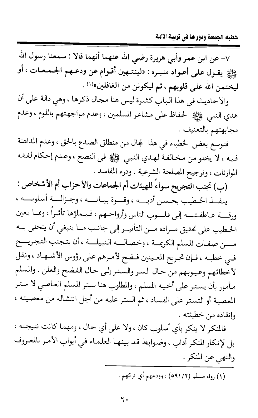 7 - عن ابن عمر وأبي هريرة رضي الله عنهما أنهما قالا: سمعنا رسول الله صلى الله عليه وسلم يقول على أعواد منبره: «لينتهين أقوام عن ودعهم الجمعات، أو ليختمن الله على قلوبهم، ثم ليكونن من الغافلين» (¬1) .