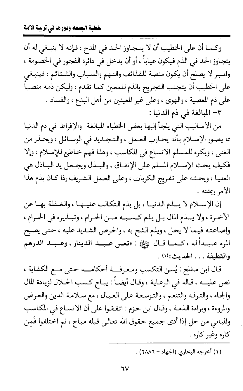 3 - المبالغة في ذم الدنيا: من الأساليب التي يلجأ إليها بعض الخطباء المبالغة والإفراط في ذم الدنيا مما يصور الإسلام بأنه يحارب العمل، والتجديد في الوسائل، ويحذر من الغنى، ويكره للمسلم الاتساع في المكاسب، وهذا فهم خاطئ للإسلام، وإلا فكيف يحث الإسلام المسلم على الإنفاق، والبذل ويجعل يد الباذل هي العليا، ويحثه على تفريج الكربات، وعلى العمل الشريف إذا كان يذم هذا الأمر ويمقته.