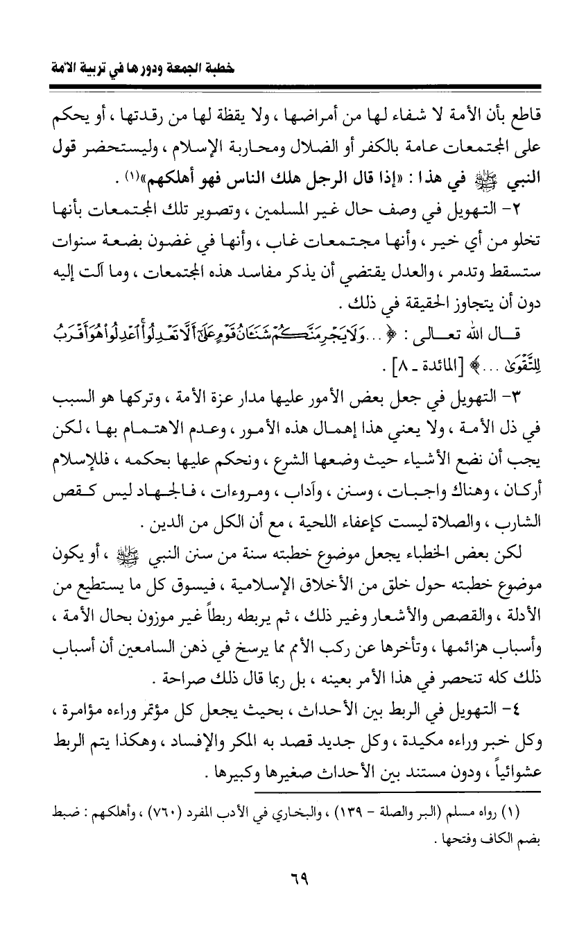 قاطع بأن الأمة لا شفاء لها من أمراضها، ولا يقظة لها من رقدتها، أو يحكم على المجتمعات عامة بالكفر أو الضلال ومحاربة الإسلام، وليستحضر قول النبي صلى الله عليه وسلم في هذا «إذا قال الرجل هلك الناس فهو أهلكهم» (¬1) .