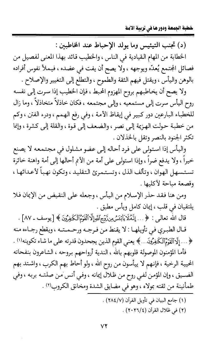 (د) تجنب التيئيس وما يولد الإحباط عند المخاطبين: الخطابة من المهام القيادية في الناس، والخطيب قائد بهذا المعنى لفصيل من فصائل المجتمع يعده ويوجهه، ولا يصح أن يفت في عضده، فيملأ نفوس أفراده بالوهن واليأس، ويقتل فيهم الثقة والطموح، والتطلع إلى التغيير والإصلاح.
