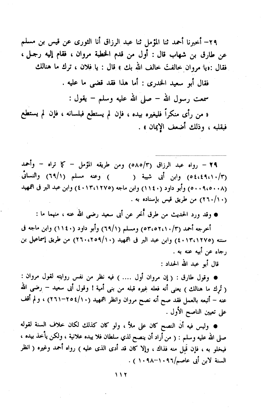أَخْبَرَنَا أَحْمَدُ، ثنا المُؤَمِّلُ، ثنا عَبْدُ الرَّزَّاقِ، أنا الثَّوْرِيُّ، عَنْ قَيْسِ بْنِ مُسْلِمٍ، عَنْ طَارِقِ بْنِ شِهَابٍ، قَالَ: أَوَّلُّ مَنْ قَدَّمَ الْخُطْبَةَ مَرْوَانُ فَقَامَ إِلَيْهِ رَجُلٌ فَقَالَ يَا مَرْوَانُ خَالَفْتَ خَالَفَ اللَّهُ بِكَ , قَالَ: يَا فُلَانُ تَرَكَ مَا هُنَالِكَ فَقَالَ أَبُو سَعِيدٍ الْخُدْرِيُّ: أَمَّا هَذَا فَقَدْ قَضَى مَا عَلَيْهِ سَمِعْتُ رَسُولَ اللَّهِ صَلَّى اللهُ عَلَيْهِ وَسَلَّمَ يَقُولُ: «§مَنْ رَأَى مُنْكَرًا فَلْيُغَيِّرْهُ بِيَدِهِ فَإِنْ لَمْ يَسْتَطِعْ فَبِلِسَانِهِ فَإِنْ لَمْ يَسْتَطِعْ فَبِقَلْبِهِ وَذَلِكَ أَضْعَفُ الْإِيمَانِ» -[113]-. أَخْبَرَنَا أَحْمَدُ قَالَ: سُئِلَ الْمُؤَمَّلُ عَنِ الضَّحَّاكِ، هَلْ سَمِعَ مِنَ ابْنِ عَبَّاسٍ، فَقَالَ: قَدْ أَدْرَكَهُ وَمَا سَمِعَ مِنْهُ، وَإِنَّمَا أَحَادِيثُهُ الْمُسْنَدَاتُ عَنْ سَعِيدِ بْنِ جُبَيْرٍ، عَنِ ابْنِ عَبَّاسٍ -[114]-. أَخْبَرَنَا أَحْمَدُ قَالَ: سُئِلَ الْمُؤَمَّلُ عَنْ مَيْمُونِ بْنِ مِهْرَانَ، فَقَالَ: قَدْ رَوَى عَنِ ابْنِ عَبَّاسٍ وَسُئِلَ الْمُؤَمَّلُ عَنْ رَفْعِ الْأَيْدِي فِي الصَّلَاةِ , قَالَ الْمُؤَمَّلُ: «وَالرَّفْعُ حَسَنٌ بِرَأْيِي» -[115]- أَخْبَرَنَا أَحْمَدُ قَالَ: سُئِلَ الْمُؤَمَّلُ وَأَنَا أَسْمَعُ عَنِ الْإِيمَانِ وَالْإِسْلَامِ، أَوَاحَدٌ هُوَ؟ فَقَالَ: «الْإِسْلَامُ أَعْلَى مِنَ الْإِيمَانِ» وَأَدَارَ دَائِرَةً كَبِيرَةً وَأُخْرَى فِي وَسَطِهَا أَصْغَرَ مِنْهَا , فَقَالَ: «هَذَا الْإِيمَانُ فِي الْإِسْلَامِ وَإِذَا عَمِلَ الْعَبْدُ بِالْإِيمَانِ فَهُوَ فِي هَذِهِ وَإِذَا عَمِلَ بِالْمَعَاصِي خَرَجَ مِنْ هَذِهِ إِلَى هَذِهِ»