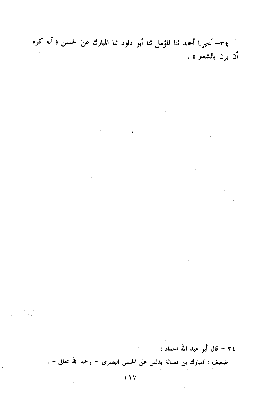 أَخْبَرَنَا أَحْمَدُ، ثنا المُؤَمِّلُ، ثنا أَبُو دَاوُدَ، ثنا الْمُبَارَكُ، عَنِ الْحَسَنِ، أَنَّهُ §كَرِهَ أَنْ يَزِنَ بِالشَّعِيرِ "