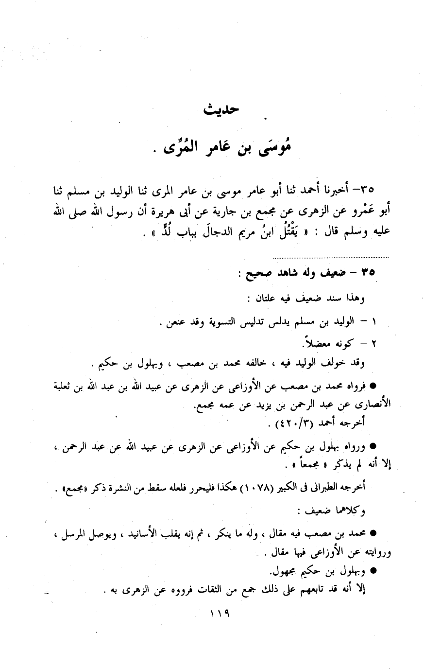 أَخْبَرَنَا أَحْمَدُ، ثنا أَبُو عَامِرٍ مُوسَى بْنُ عَامِرٍ المُرِّيُّ، ثنا الْوَلِيدُ بْنُ مُسْلِمٍ، ثنا أَبُو عَمْرٍو، عَنِ الزُّهْرِيِّ، عَنْ مُجَمِّعِ بْنِ جَارِيَةَ، عَنْ أَبِي هُرَيْرَةَ، أَنَّ رَسُولَ اللَّهِ صَلَّى اللهُ عَلَيْهِ وَسَلَّمَ قَالَ: «§يَقْتُلُ ابْنُ مَرْيَمَ الدَّجَّالَ بِبَابِ لُدٍّ»