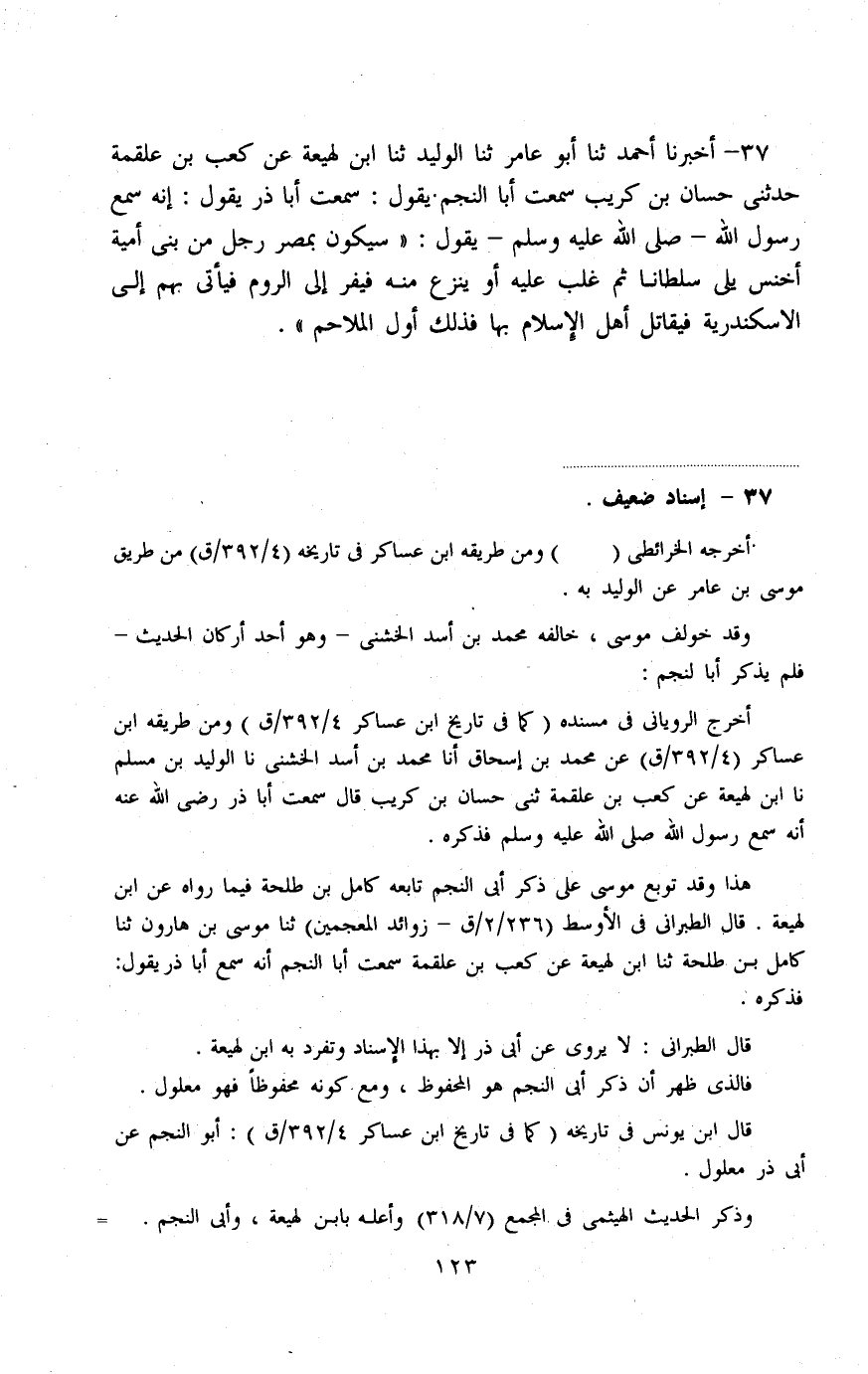 أَخْبَرَنَا أَحْمَدُ، ثنا أَبُو عَامِرٍ، ثنا الْوَلِيدُ، ثنا ابْنُ لَهِيعَةَ، عَنْ كَعْبِ بْنِ عَلْقَمَةَ، حَدَّثَنِي حَسَّانُ بْنُ كُرَيْبٍ، سَمِعْتُ أَبَا النَّجْمِ، يَقُولُ: سَمِعْتُ أَبَا ذَرٍّ، يَقُولُ إِنَّهُ سَمِعَ رَسُولَ اللَّهِ صَلَّى اللهُ عَلَيْهِ وَسَلَّمَ، يَقُولُ: «§سَيَكُونُ بِمِصْرَ رَجُلٌ مِنْ بَنِي أُمَيَّةَ أَخْنَسُ يَلِي سُلْطَانًا ثُمَّ غُلِبَ عَلَيْهِ أَوْ يَنْزِعُ مِنْهُ فَيَفِرُّ إِلَى الرُّومِ فَيَأْتِي بِهِمْ إِلَى الْإِسْكَنْدَرِيَّةِ فَيُقَاتِلُ أَهْلَ الْإِسْلَامِ بِهَا فَذَلِكَ أَوَّلُ الْمَلَاحِمِ»