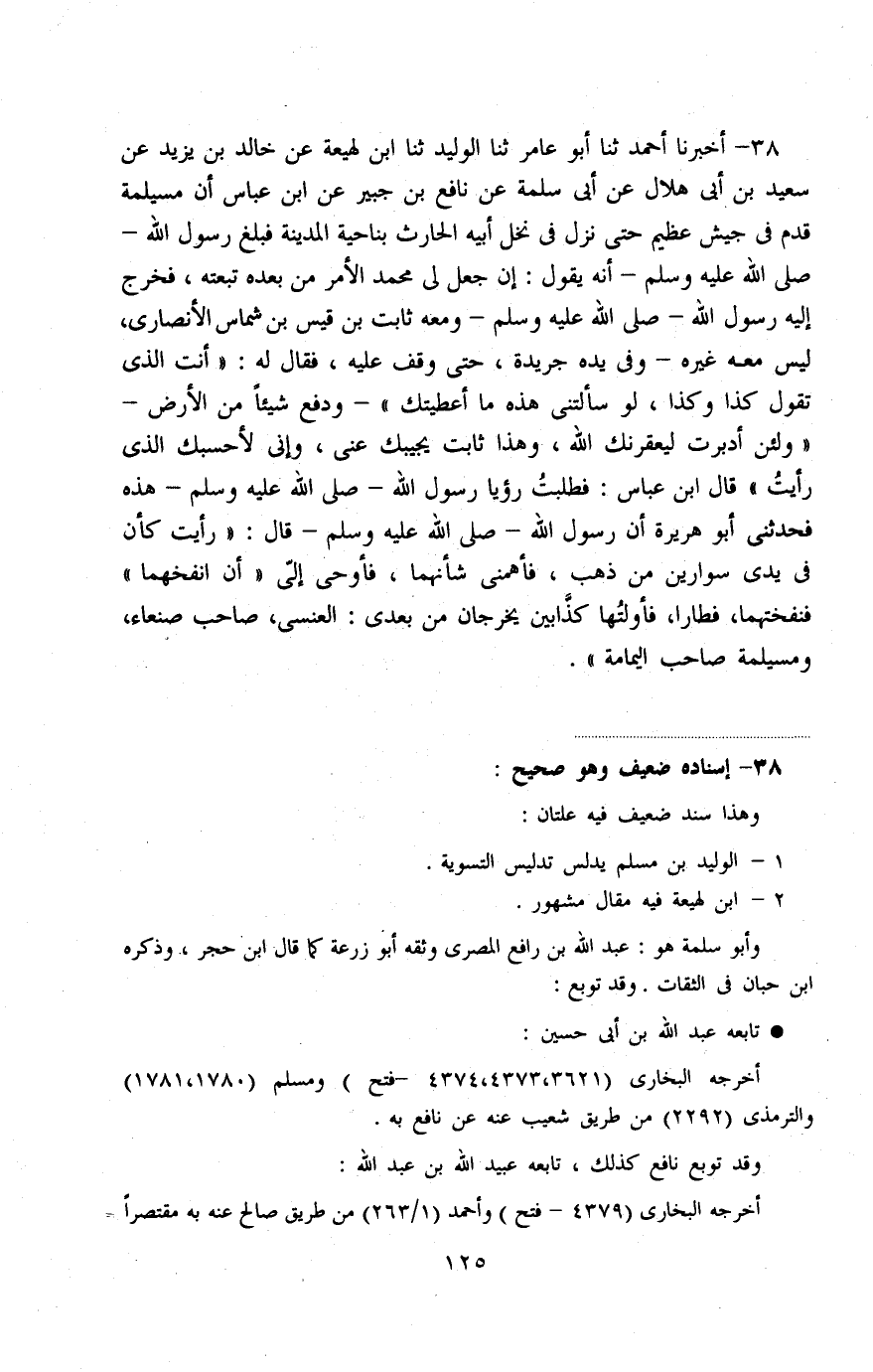 أَخْبَرَنَا أَحْمَدُ، ثنا أَبُو عَامِرٍ، ثنا الْوَلِيدُ، ثنا ابْنُ لَهِيعَةَ، عَنْ خَالِدِ بْنِ يَزِيدَ، عَنْ سَعِيدِ بْنِ أَبِي هِلَالٍ، عَنْ أَبِي سَلَمَةِ، عَنْ نَافِعِ بْنِ جُبَيْرٍ، عَنِ ابْنِ عَبَّاسٍ، أَنَّ مُسَيْلِمَةَ قَدِمَ فِي جَيْشٍ عَظِيمٍ حَتَّى نَزَلَ فِي نَخْلِ أَبِيهِ الْحَارِثِ بِنَاحِيَةِ الْمَدِينَةِ فَبَلَغَ رَسُولَ اللَّهِ صَلَّى اللهُ عَلَيْهِ وَسَلَّمَ أَنَّهُ يَقُولُ إِنْ جَعَلَ لِي مُحَمَّدٌ الْأَمْرَ مِنْ بَعْدِهِ تَبِعْتُهُ فَخَرَجَ إِلَيْهِ رَسُولُ اللَّهِ صَلَّى اللهُ عَلَيْهِ وَسَلَّمَ وَمَعَهُ ثَابِتُ بْنُ قَيْسِ بْنِ شَمَّاسٍ الْأَنْصَارِيُّ لَيْسَ مَعَهُ غَيْرُهُ وَفِي يَدِهِ جَرِيدَةٌ حَتَّى وَقَفَ عَلَيْهِ، فَقَالَ لَهُ أَنْتَ الَّذِي تَقُولُ كَذَا وَكَذَا لَوْ سَأَلْتَنِي هَذِهِ مَا أَعْطَيْتُكَ وَدَفَعَ شَيْئًا مِنَ الْأَرْضِ وَلَئِنْ أَدْبَرَتْ لَيَعْقِرَنَّكَ اللَّهُ وَهَذَا ثَابِتٌ يُجِيبُكَ عَنَى وَإِنِّي لَأَحْسَبُكَ الَّذِي رَأَيْتُ، قَالَ ابْنُ عَبَّاسٍ فَطَلَبْتُ رُؤْيَا رَسُولِ اللَّهِ صَلَّى اللهُ عَلَيْهِ وَسَلَّمَ هَذِهِ فَحَدَّثَنِي أَبُو هُرَيْرَةَ أَنَّ رَسُولَ اللَّهِ صَلَّى اللهُ عَلَيْهِ وَسَلَّمَ قَالَ: " §رَأَيْتُ كَأَنَّ فِي يَدِي سِوَارَيْنِ مِنْ ذَهَبٍ، فَأَهَمَّنِي شَأْنُهُمَا، فَأُوحِيَ إِلَيَّ أَنِ انْفُخْهُمَا، فَنَفَخْتُهُمَا فَطَارَا، فَأَوَّلْتُهَا كَذَّابَيْنِ يَخْرُجَانِ مِنْ بَعْدِي: الْعَنْسِيُّ صَاحِبُ صَنْعَاءَ وَمُسَيْلَمَةَ صَاحِبُ الْيَمَامَةِ "
