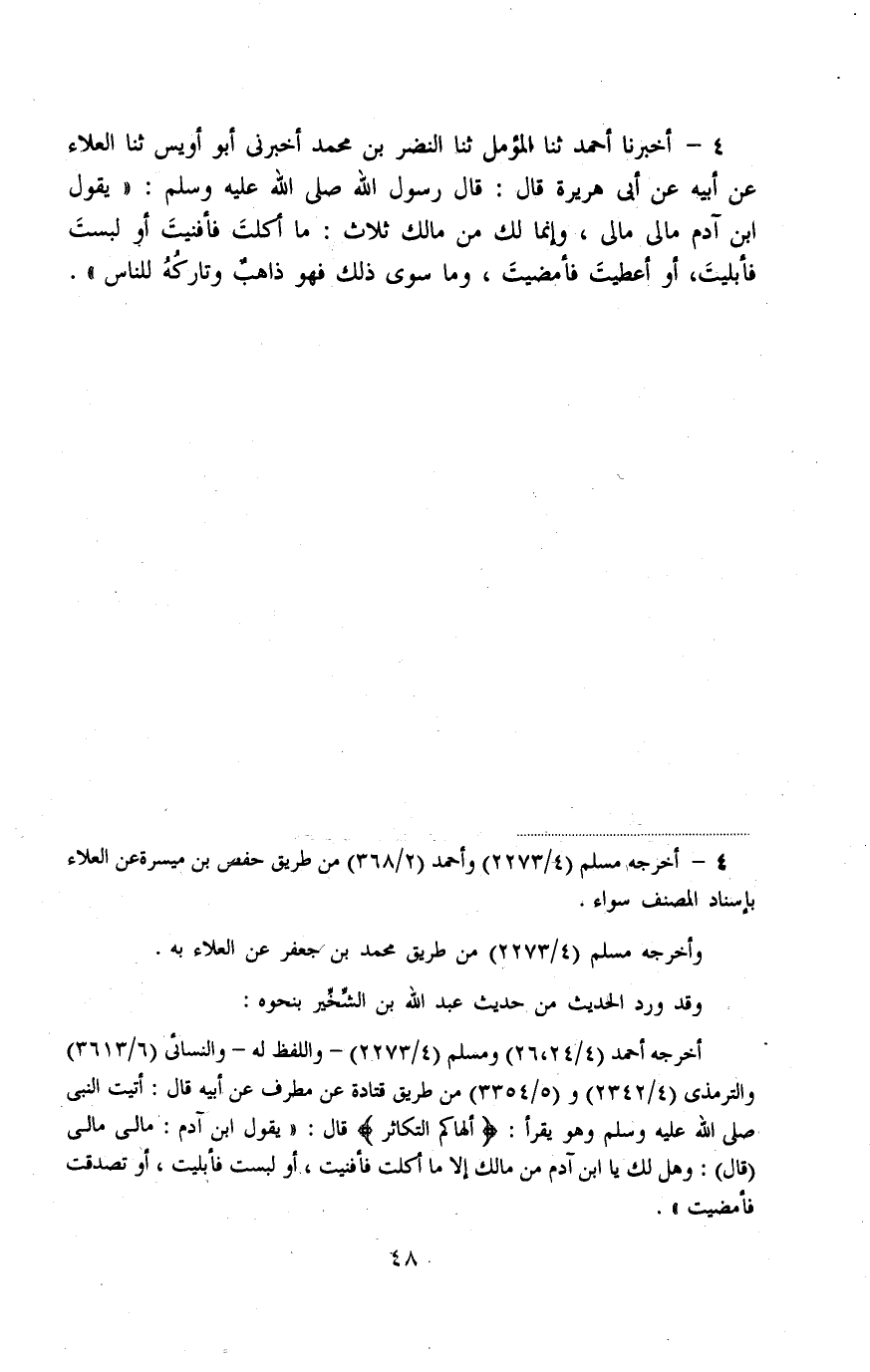 4 - أَخْبَرَنَا أَحْمَدُ، ثنا المُؤَمِّلُ، ثنا النَّضْرُ بْنُ مُحَمَّدٍ، أَخْبَرَنِي أَبُو أُوَيْسٍ، ثنا الْعَلَاءُ، عَنْ أَبِيهِ، عَنْ أَبِي هُرَيْرَةَ، قَالَ قَالَ رَسُولُ اللَّهِ صَلَّى اللهُ عَلَيْهِ وَسَلَّمَ: «§يَقُولُ ابْنُ آدَمَ مَالِي مَالِي , وَإِنَّمَا لَكَ مِنْ مَالِكِ ثَلَاثٌ مَا أَكَلْتَ فَأَفْنَيْتَ أَوْ لَبِسْتَ فَأَبْلَيْتَ أَوْ أَعْطَيْتَ فَأَمْضَيْتَ وَمَا سِوَى ذَلِكَ فَهُوَ ذَاهِبٌ وَتَارِكُهُ لِلنَّاسِ»