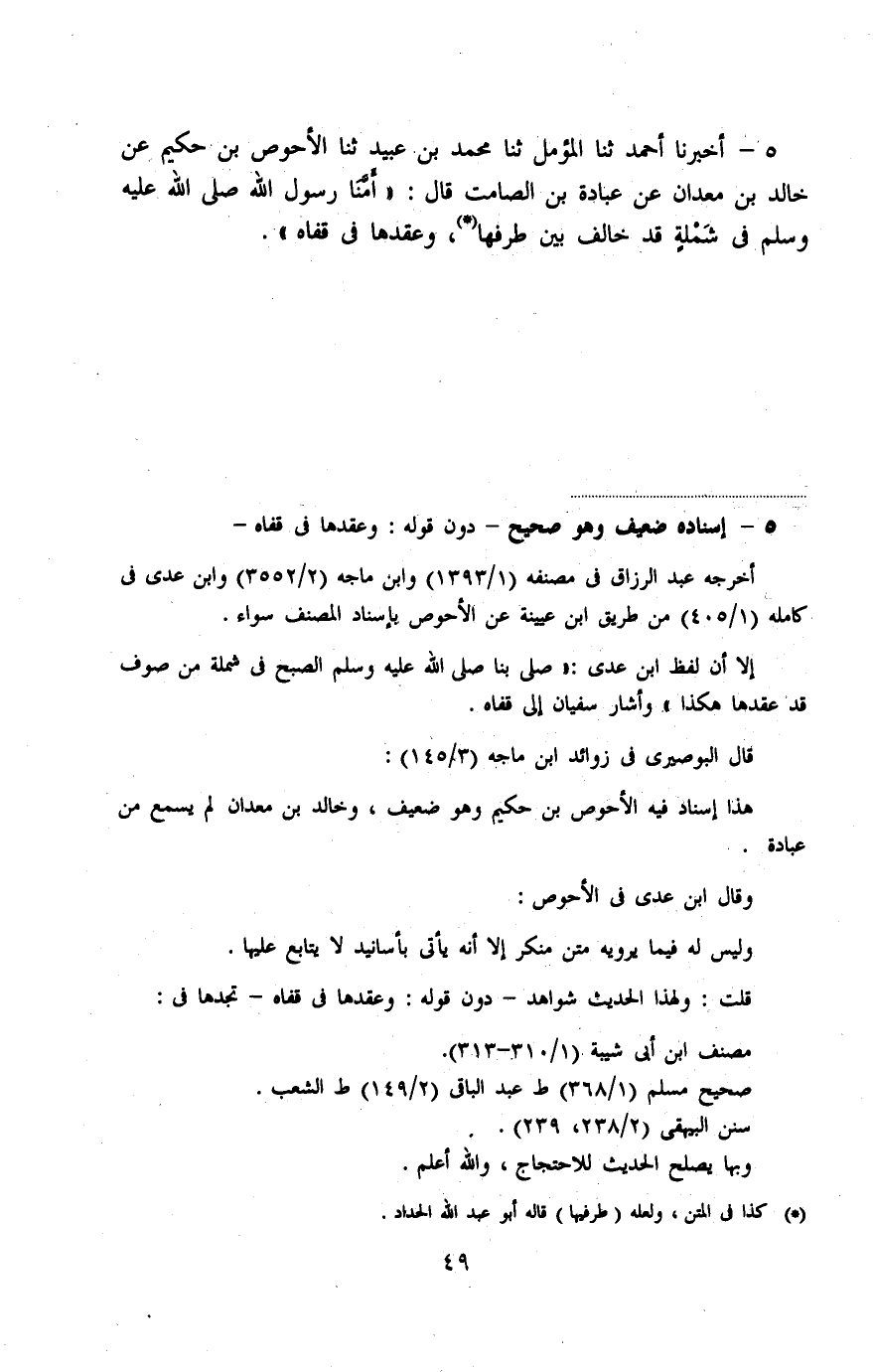 5 - أَخْبَرَنَا أَحْمَدُ، ثنا المُؤَمِّلُ، ثنا مُحَمَّدُ بْنُ عُبَيْدٍ، ثنا الْأَحْوَصُ بْنُ حَكِيمٍ، عَنْ خَالِدِ بْنِ مَعْدَانَ، عَنْ عُبَادَةَ بْنِ الصَّامِتِ، قَالَ: «§أَمَّنَا رَسُولُ اللَّهِ صَلَّى اللهُ عَلَيْهِ وَسَلَّمَ فِي شَمْلَةٍ قَدْ خَالَفَ بَيْنَ طَرَفِهَا وَعَقَدَهَا فِي قَفَاهُ»
