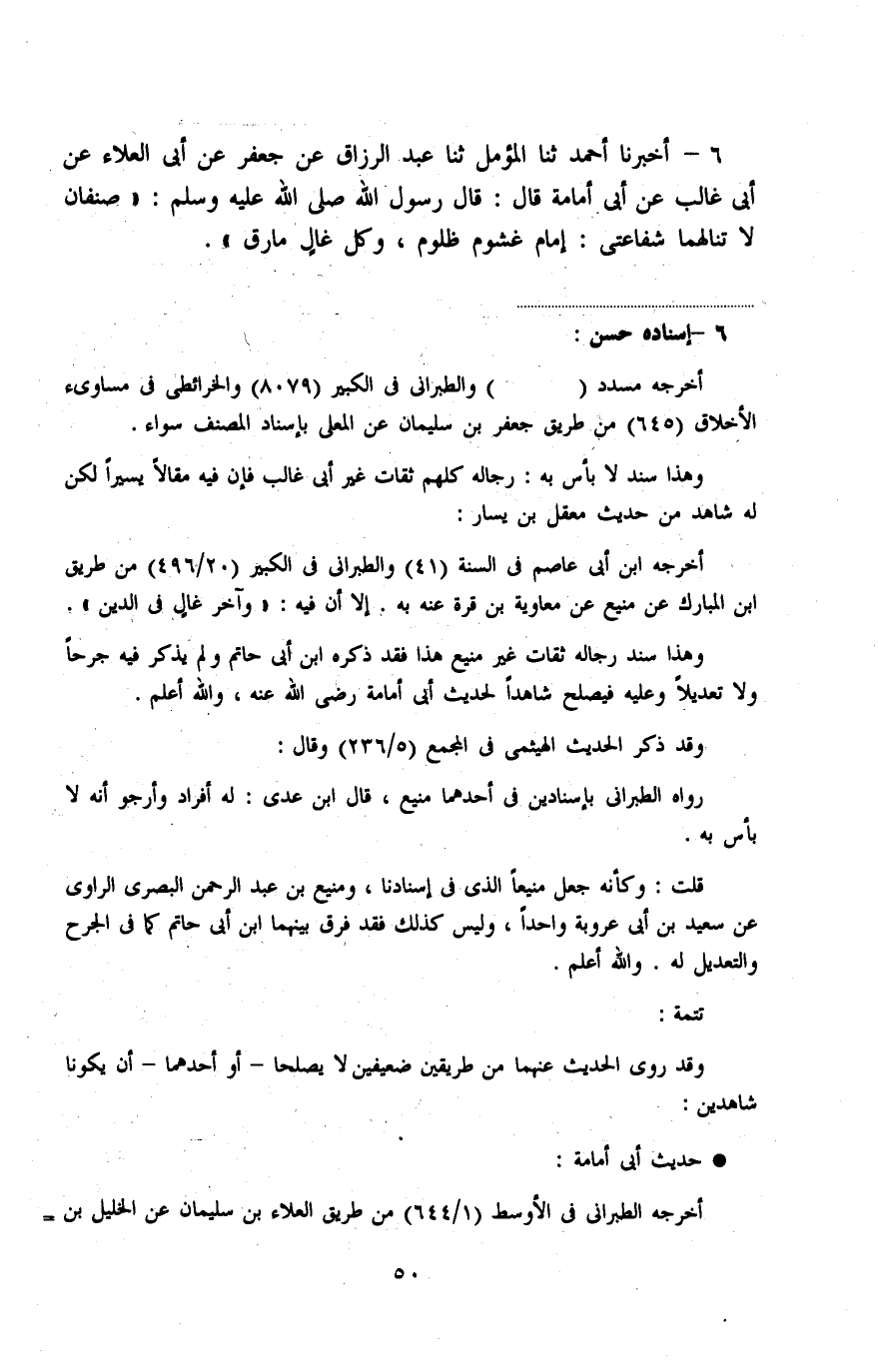 6 - أَخْبَرَنَا أَحْمَدُ، ثنا المُؤَمِّلُ، ثنا عَبْدُ الرَّزَّاقِ، عَنْ جَعْفَرٍ، عَنْ أَبِي الْعَلَاءِ، عَنْ أَبِي غَالِبٍ، عَنْ أَبِي أُمَامَةَ، قَالَ قَالَ رَسُولُ اللَّهِ صَلَّى اللهُ عَلَيْهِ وَسَلَّمَ: " §صِنْفَانِ لَا تَنَالُهُمَا شَفَاعَتِي: إِمَامٌ غَشُومٌ ظَلُومٌ وَكُلُّ غَالٍّ مَارِقٍ "