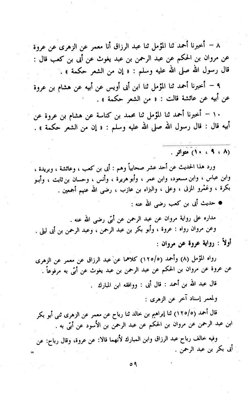 أَخْبَرَنَا أَحْمَدُ، ثنا المُؤَمِّلُ، ثنا عَبْدُ الرَّزَّاقِ , أنا مَعْمَرٌ، عَنِ الزُّهْرِيِّ، عَنْ عُرْوَةَ، عَنْ مَرْوَانَ بْنِ الْحَكَمِ، عَنْ عَبْدِ الرَّحْمَنِ بْنِ عَبْدِ يَغُوثَ، عَنْ أُبَيِّ بْنِ كَعْبٍ، قَالَ: قَالَ رَسُولُ اللَّهِ صَلَّى اللهُ عَلَيْهِ وَسَلَّمَ: «إِنَّ §مِنَ الشَّعْرِ حِكْمَةٌ»