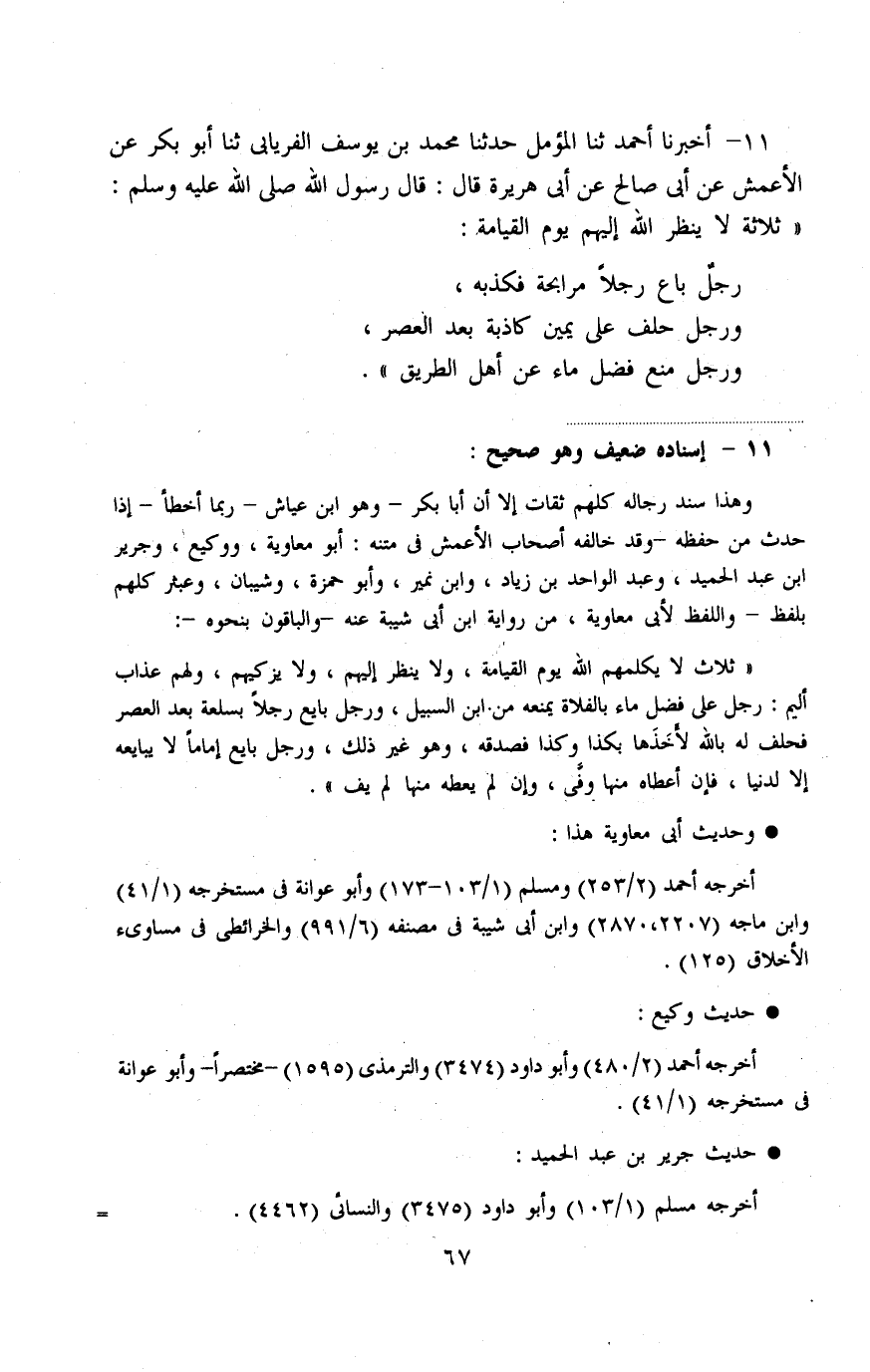 أَخْبَرَنَا أَحْمَدُ، ثنا المُؤَمِّلُ، حَدَّثَنَا مُحَمَّدُ بْنُ يُوسُفَ الْفِرْيَابِيُّ، ثنا أَبُو بَكْرٍ، عَنِ الْأَعْمَشِ، عَنْ أَبِي صَالِحٍ، عَنْ أَبِي هُرَيْرَةَ، قَالَ قَالَ رَسُولُ اللَّهِ صَلَّى اللهُ عَلَيْهِ وَسَلَّمَ: «§ثَلَاثَةٌ لَا يَنْظُرُ اللَّهُ إِلَيْهِمْ يَوْمَ الْقِيَامَةِ رَجُلٌ بَاعَ رَجُلًا مُرَابَحَةً فَكَذبْهُ , وَرَجُلٌ حَلَفَ عَلَى يَمِينٍ كَاذِبَةٍ بَعْدَ الْعَصْرِ , وَرَجُلٌ مَنَعَ فَضْلَ مَاءٍ عَنْ أَهْلِ الطَّرِيقِ»