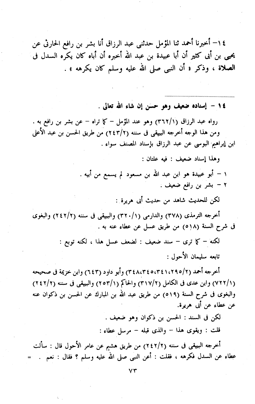 75 - أَخْبَرَنَا أَحْمَدُ، ثنا المُؤَمِّلُ، حَدَّثَنِي، عَبْدُ الرَّزَّاقِ، أنا بِشْرُ بْنُ رَافِعٍ الْحَارِثِيُّ، عَنْ يَحْيَى بْنِ أَبِي كَثِيرٍ، أَنَّ أَبَا عُبَيْدَةَ بْنَ عَبْدِ اللَّهِ أَخْبَرَهُ أَنَّ أَبَاهُ كَانَ §يَكْرَهُ السَّدْلَ فِي الصَّلَاةِ وَذَكَرَ أَنَّ النَّبِيَّ صَلَّى اللهُ عَلَيْهِ وَسَلَّمَ كَانَ يَكْرَهُهُ "