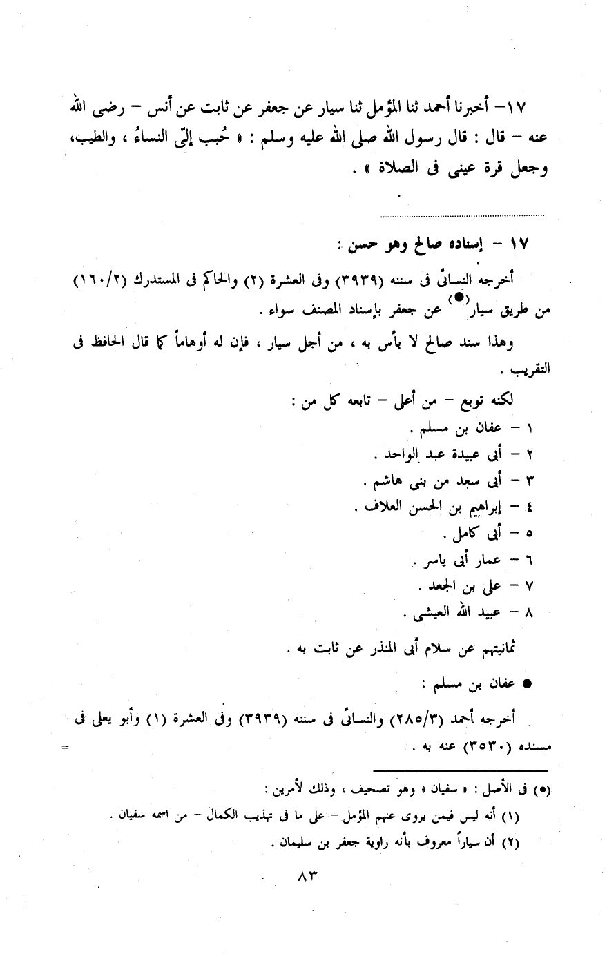 أَخْبَرَنَا أَحْمَدُ، ثنا المُؤَمِّلُ، ثنا سَيَّارٌ، عَنْ جَعْفَرٍ، عَنْ ثَابِتٍ، عَنْ أَنَسٍ، رَضِيَ اللَّهُ عَنْهُ قَالَ قَالَ رَسُولُ اللَّهِ صَلَّى اللهُ عَلَيْهِ وَسَلَّمَ: «§حُبِّبَ إِلَيَّ النِّسَاءُ وَالطِّيبُ وَجُعِلَ قُرَّةُ عَيْنِي فِي الصَّلَاةِ»