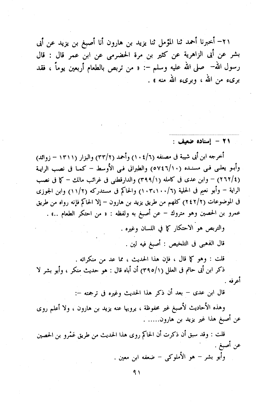 أَخْبَرَنَا أَحْمَدُ، ثنا المُؤَمِّلُ، ثنا يَزِيدُ بْنُ هَارُونَ، أنا أَصْبَغُ بْنُ يَزِيدَ، عَنْ أَبِي بِشْرٍ، عَنْ أَبِي الزَّاهِرِيَّةِ، عَنْ كَثِيرِ بْنِ مُرَّةَ الْحَضْرَمِيِّ، عَنِ ابْنِ عُمَرَ، قَالَ قَالَ رَسُولُ اللَّهِ صَلَّى اللهُ عَلَيْهِ وَسَلَّمَ: «§مَنْ تَرَبَّصَ بِالطَّعَامِ أَرْبَعِينَ يَوْمًا فَقَدْ بَرِئَ مِنَ اللَّهِ وَبَرِئَ اللَّهُ مِنْهُ»