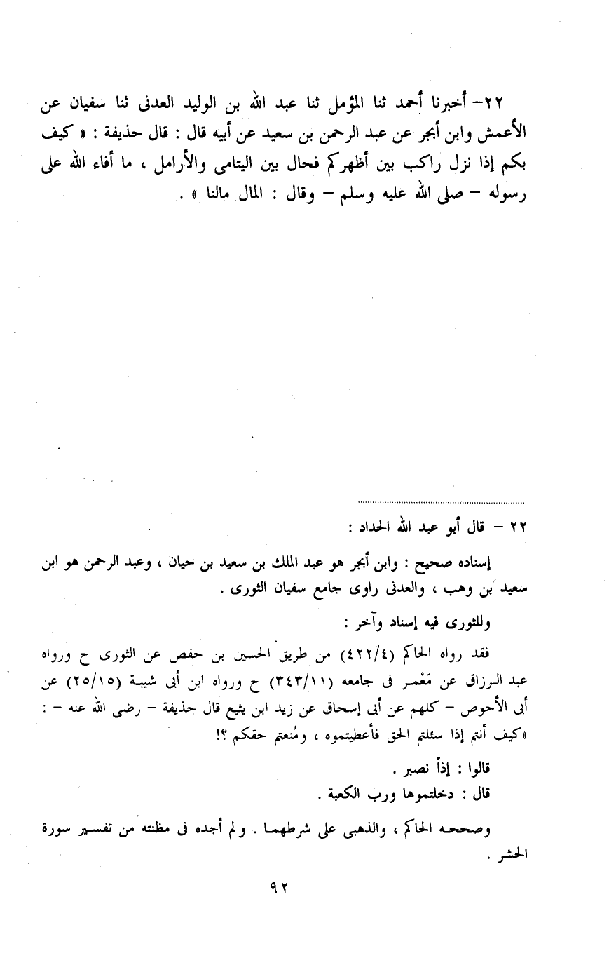 أَخْبَرَنَا أَحْمَدُ، ثنا المُؤَمِّلُ، ثنا عَبْدُ اللَّهِ بْنُ الْوَلِيدِ الْعَدَنِيُّ، ثنا سُفْيَانُ، عَنِ الْأَعْمَشِ، وَابْنُ أَبْجَرَ , عَنْ عَبْدِ الرَّحْمَنِ بْنِ سَعِيدٍ، عَنْ أَبِيهِ، قَالَ: قَالَ حُذَيْفَةُ: §كَيْفَ بِكُمْ إِذَا نَزَلَ رَاكِبٌ بَيْنَ أَظْهُرِكُمْ فَحَالَ بَيْنَ الْيَتَامَى وَالْأَرَامِلِ مَا أَفَاءَ اللَّهُ عَلَى رَسُولِهِ صَلَّى اللهُ عَلَيْهِ وَسَلَّمَ وَقَالَ: الْمَالُ مَالَنَا "