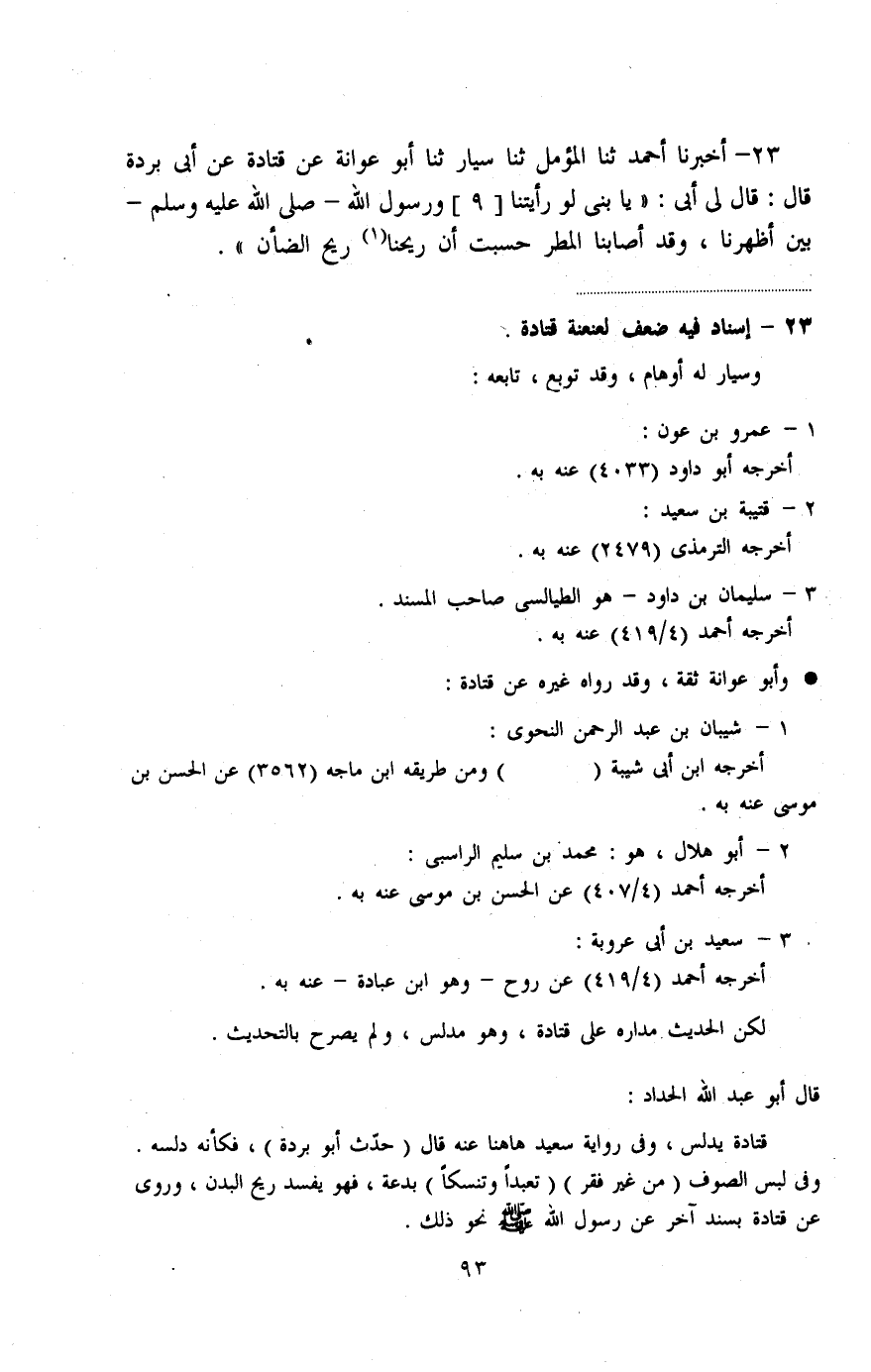 أَخْبَرَنَا أَحْمَدُ، ثنا المُؤَمِّلُ، ثنا سَيَّارٌ، ثنا أَبُو عَوَانَةَ، عَنْ قَتَادَةَ، عَنْ أَبِي بُرْدَةَ، قَالَ: قَالَ لِي أَبِي: يَا بُنَيَّ §لَوْ رَأَيْتَنَا وَرَسُولُ اللَّهِ صَلَّى اللهُ عَلَيْهِ وَسَلَّمَ بَيْنَ أَظْهُرِنَا وَقَدْ أَصَابَنَا الْمَطَرُ حَسِبْتَ أَنَّ رِيحَنَا رِيحُ الضَّأْنِ "