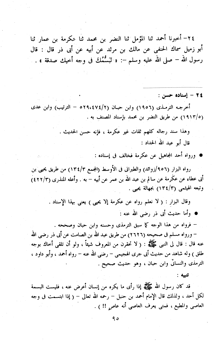 أَخْبَرَنَا أَحْمَدُ، ثنا المُؤَمِّلُ، ثنا النَّضْرُ بْنُ مُحَمَّدٍ، ثنا عِكْرِمَةُ بْنُ عَمَّارٍ، ثنا أَبُو زُمَيْلٍ سِمَاكٌ الْحَنَفِيُّ , عَنْ مَالِكِ بْنِ مَرْثَدٍ، عَنْ أَبِيهِ، عَنْ أَبِي ذَرٍّ، قَالَ: قَالَ رَسُولُ اللَّهِ صَلَّى اللهُ عَلَيْهِ وَسَلَّمَ: «§تَبَسُّمُكَ فِي وَجْهِ أَخِيكَ صَدَقَةٌ»