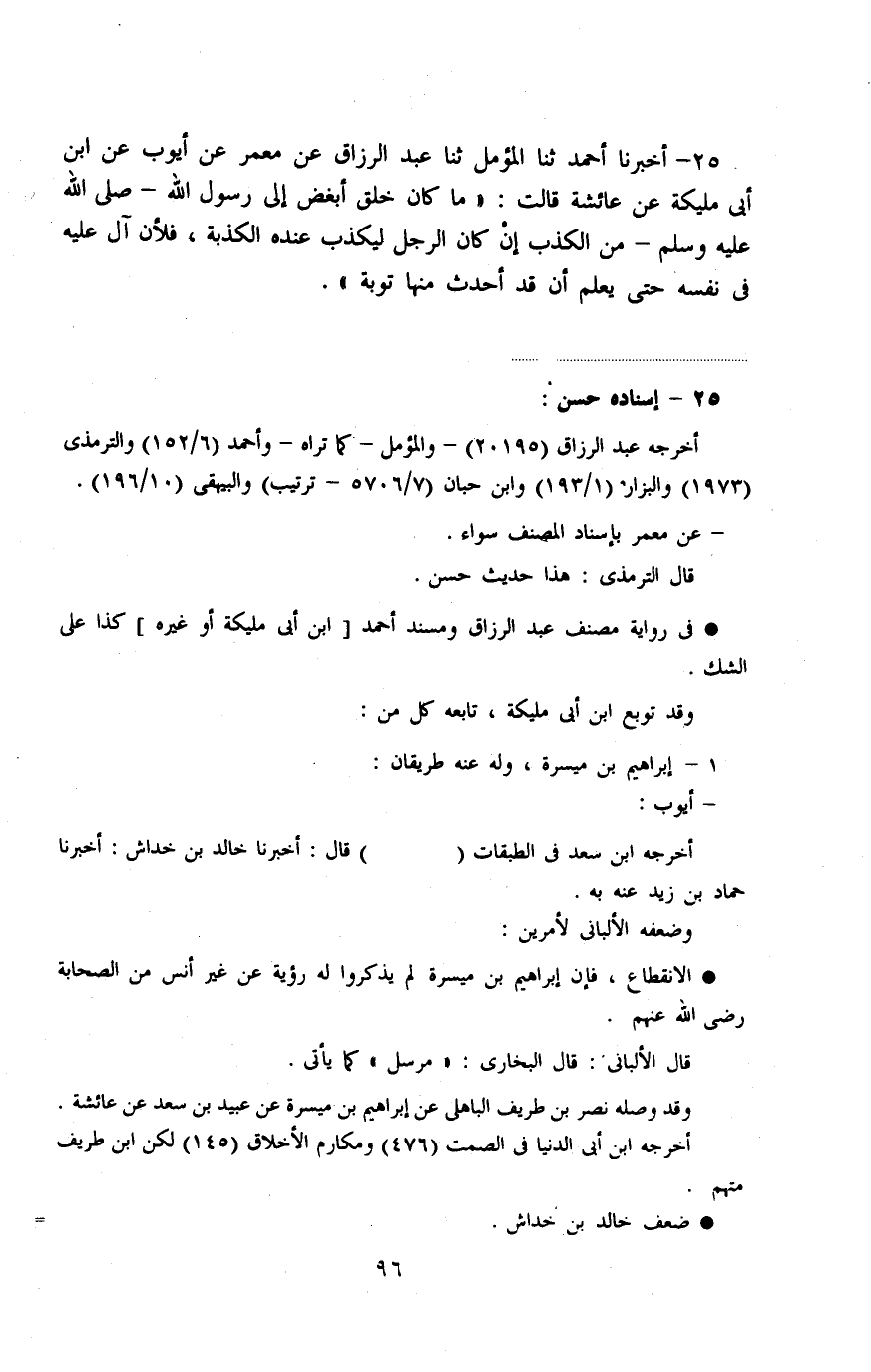 أَخْبَرَنَا أَحْمَدُ، ثنا المُؤَمِّلُ، ثنا عَبْدُ الرَّزَّاقِ، عَنْ مَعْمَرٍ، عَنْ أَيُّوبَ، عَنِ ابْنِ أَبِي مُلَيْكَةَ، عَنْ عَائِشَةَ، قَالَتْ: «§مَا كَانَ خُلُقٌ أَبْغَضُ إِلَى رَسُولِ اللَّهِ صَلَّى اللهُ عَلَيْهِ وَسَلَّمَ مِنَ الْكَذِبِ إِنْ كَانَ الرَّجُلُ لَيَكْذِبُ عِنْدَهُ الْكَذِبَةَ فَلَأَنْ آلَ عَلَيْهِ فِي نَفْسِهِ حَتَّى يَعْلَمَ أَنْ قَدْ أَحْدَثَ مِنْهَا تَوْبَةً»