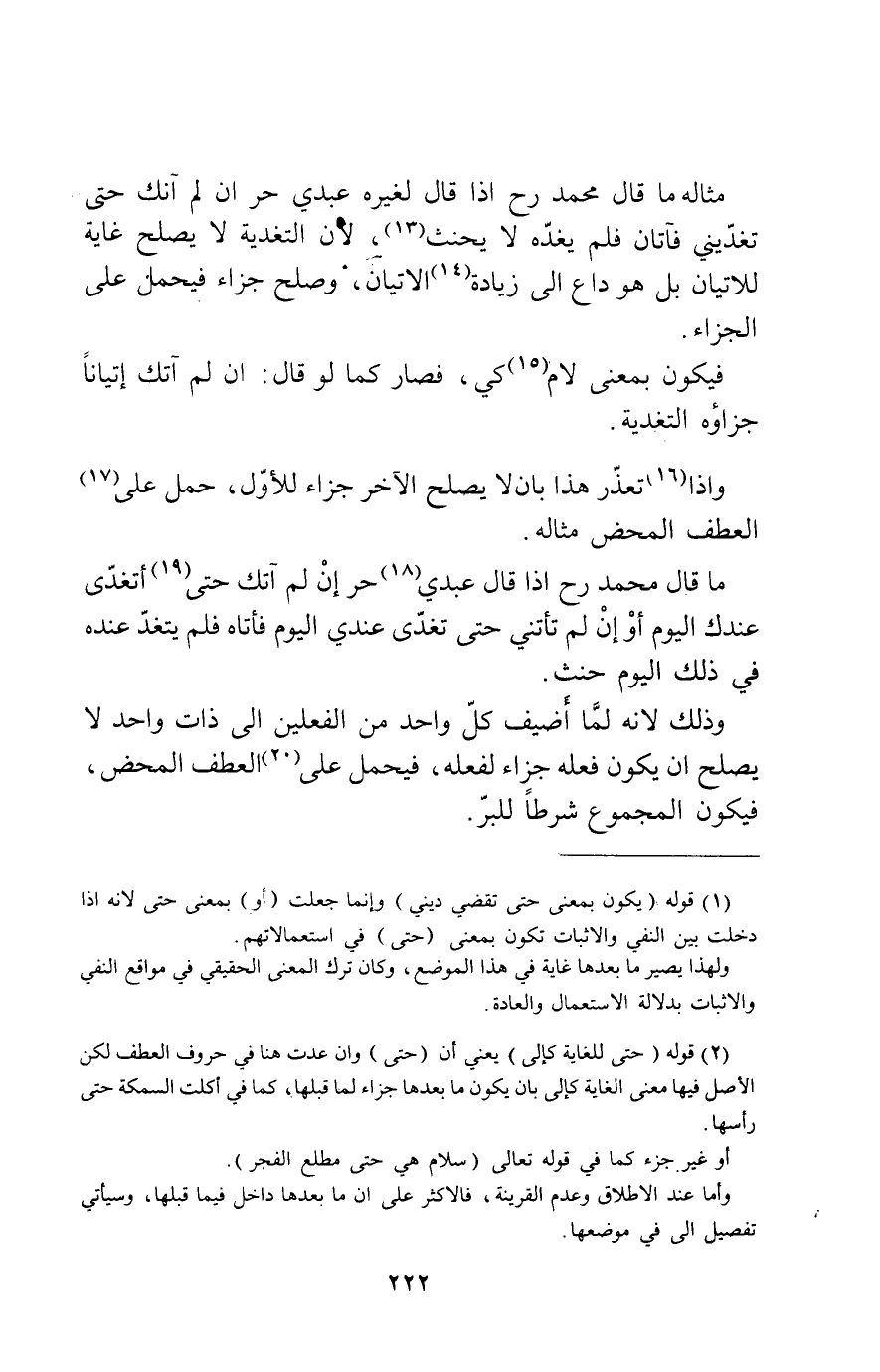 مِثَاله مَا قَالَ مُحَمَّد رح إِذا قَالَ لغيره عَبدِي حر إِن لم آتِك حَتَّى تغديني فآتان فَلم يغده لَا يَحْنَث لِأَن التغدية لَا تصلح غَايَة للأتيان بل هِيَ دَاع الى زِيَادَة الأتيان وَصلح جَزَاء فَيحمل على الْجَزَاء