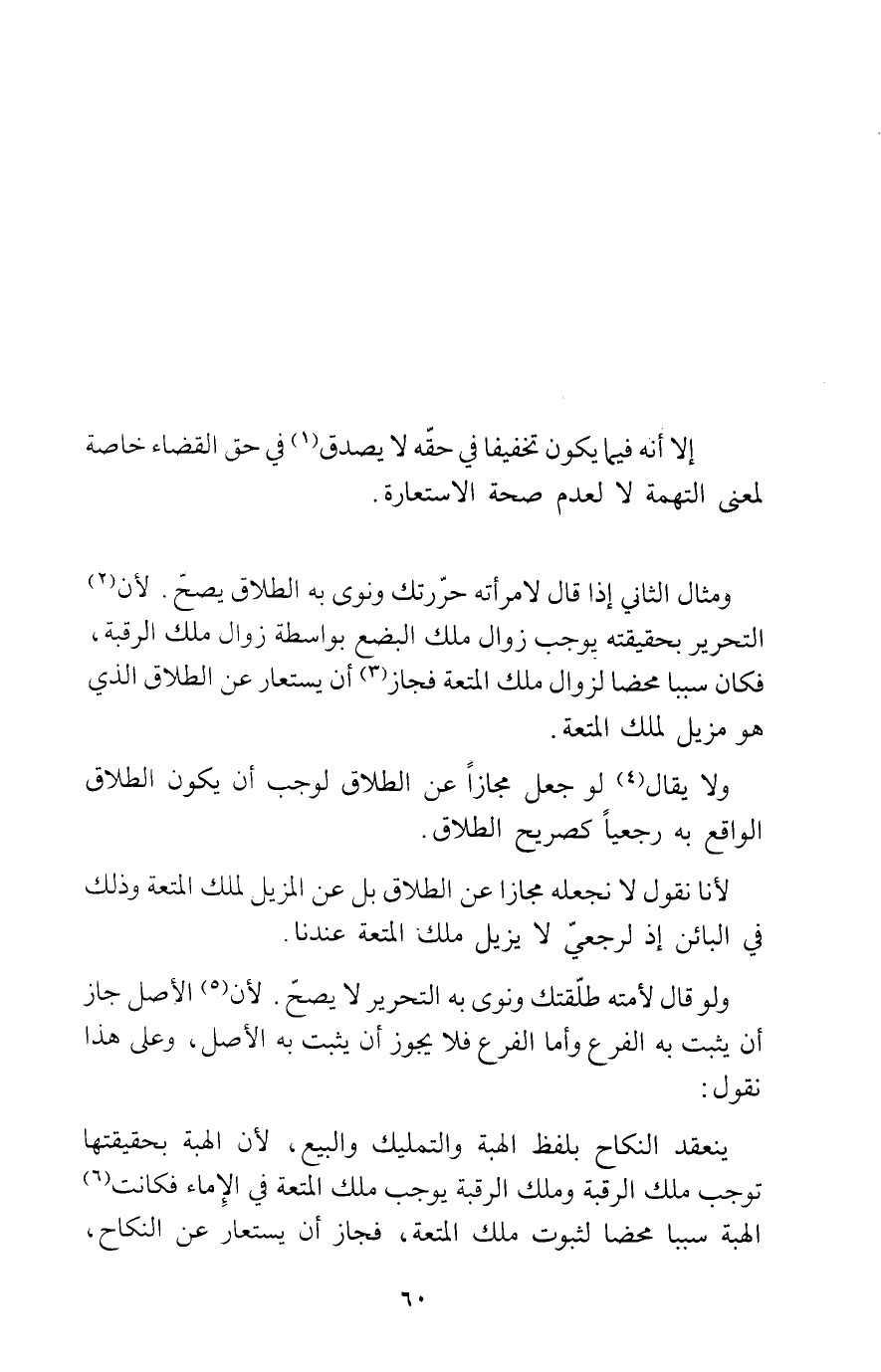 وَمِثَال الثَّانِي إِذا قَالَ لامْرَأَته حررتك وَنوى بِهِ الطَّلَاق يَصح لِأَن التَّحْرِير بحقيقته يُوجب زَوَال ملك الْبضْع بِوَاسِطَة زَوَال ملك الرقبه فَكَانَ سَببا مَحْضا لزوَال ملك الْمُتْعَة فَجَاز أَن يستعار عَن الطَّلَاق الَّذِي هُوَ مزيل لملك الْمُتْعَة