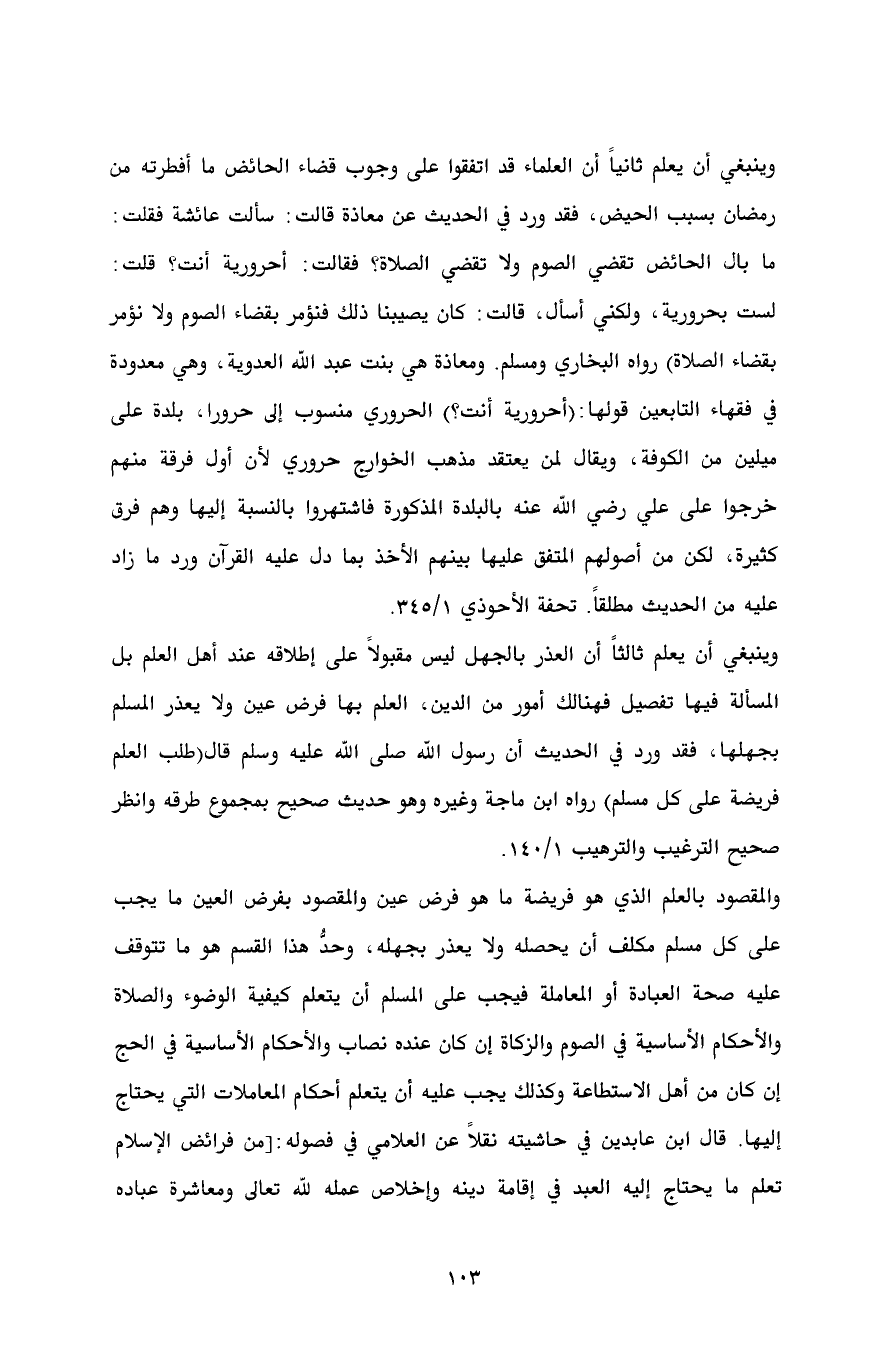 والمقصود بالعلم الذي هو فريضة ما هو فرض عين والمقصود بفرض العين ما يجب على كل مسلم مكلف أن يحصله ولا يعذر بجهله، وحدُّ هذا القسم هو ما تتوقف عليه صحة العبادة أو المعاملة فيجب على المسلم أن يتعلم كيفية الوضوء والصلاة والأحكام الأساسية في الصوم والزكاة إن كان عنده نصاب والأحكام الأساسية في الحج إن كان من أهل الاستطاعة وكذلك يجب عليه أن يتعلم أحكام المعاملات التي يحتاج إليها. قال ابن عابدين في حاشيته نقلاً عن العلامي في فصوله: [من فرائض الإسلام تعلم ما يحتاج إليه العبد في إقامة دينه وإخلاص عمله لله تعالى ومعاشرة عباده