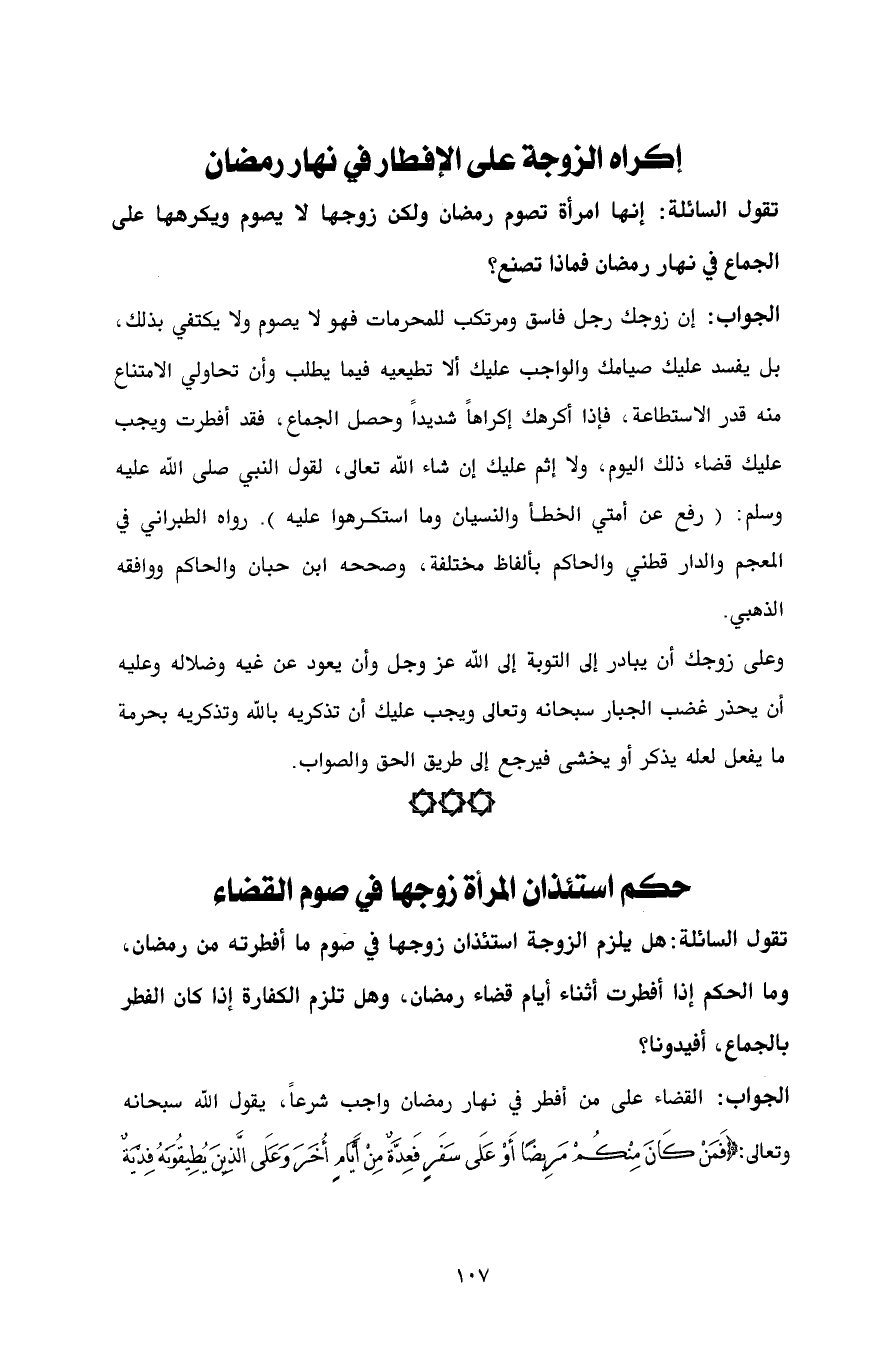 الجواب: إن زوجك رجل فاسق ومرتكب للمحرمات فهو لا يصوم ولا يكتفي بذلك، بل يفسد عليك صيامك والواجب عليك ألا تطيعيه فيما يطلب وأن تحاولي الامتناع منه قدر الاستطاعة، فإذا أكرهك إكراهاً شديداً وحصل الجماع، فقد أفطرت ويجب عليك قضاء ذلك اليوم، ولا إثم عليك إن شاء الله تعالى، لقول النبي صلى الله عليه وسلم: (رفع عن أمتي الخطأ والنسيان وما استكرهوا عليه). رواه الطبراني في المعجم والدارقطني والحاكم بألفاظ مختلفة، وصححه ابن حبان والحاكم ووافقه الذهبي.