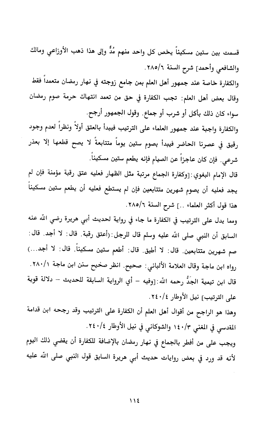 قال الإمام البغوي: [وكفارة الجماع مرتبة مثل الظهار فعليه عتق رقبة مؤمنة فإن لم يجد فعليه أن يصوم شهرين متتابعين فإن لم يستطع فعليه أن يطعم ستين مسكيناً هذا قول أكثر العلماء .. ] شرح السنة 6/ 285.