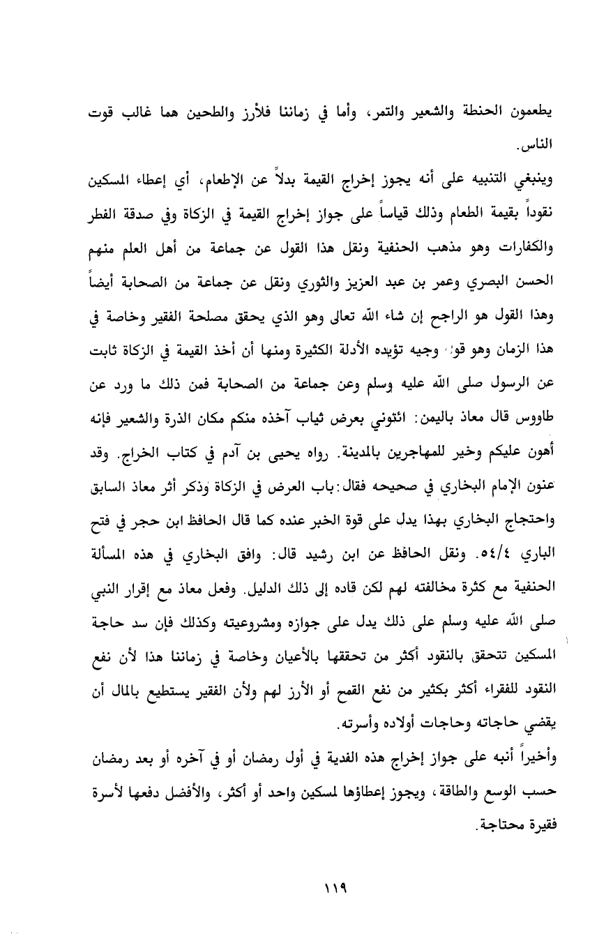 وينبغي التنبيه على أنه يجوز إخراج القيمة بدلاً عن الإطعام، أي إعطاء المسكين نقوداً بقيمة الطعام وذلك قياساً على جواز إخراج القيمة في الزكاة وفي صدقة الفطر والكفارات وهو مذهب الحنفية ونقل هذا القول عن جماعة من أهل العلم منهم الحسن البصري وعمر بن عبد العزيز والثوري ونقل عن جماعة من الصحابة أيضاً وهذا القول هو الراجح إن شاء الله تعالى وهو الذي يحقق مصلحة الفقير وخاصة في هذا الزمان وهو قول وجيه تؤيده الأدلة الكثيرة ومنها أن أخذ القيمة في الزكاة ثابت عن الرسول صلى الله عليه وسلم وعن جماعة من الصحابة فمن ذلك ما ورد عن طاووس قال معاذ باليمن: ائتوني بعرض ثياب آخذه منكم مكان الذرة والشعير فإنه أهون عليكم وخير للمهاجرين بالمدينة. رواه يحيى بن آدم في كتاب الخراج. وقد عنون الإمام البخاري في صحيحه فقال: باب العرض في الزكاة وذكر أثر معاذ السابق واحتجاج البخاري بهذا يدل على قوة الخبر عنده كما قال الحافظ ابن حجر في فتح الباري 4/ 54. ونقل الحافظ عن ابن رشيد قال: وافق البخاري في هذه المسألة الحنفية مع كثرة مخالفته لهم لكن قاده إلى ذلك الدليل. وفعل معاذ مع إقرار النبي صلى الله عليه وسلم على ذلك يدل على جوازه ومشروعيته وكذلك فإن سد حاجة المسكين تتحقق بالنقود أكثر من تحققها بالأعيان وخاصة في زماننا هذا لأن نفع النقود للفقراء أكثر بكثير من نفع القمح أو الأرز لهم ولأن الفقير يستطيع بالمال أن يقضي حاجاته وحاجات أولاده وأسرته.