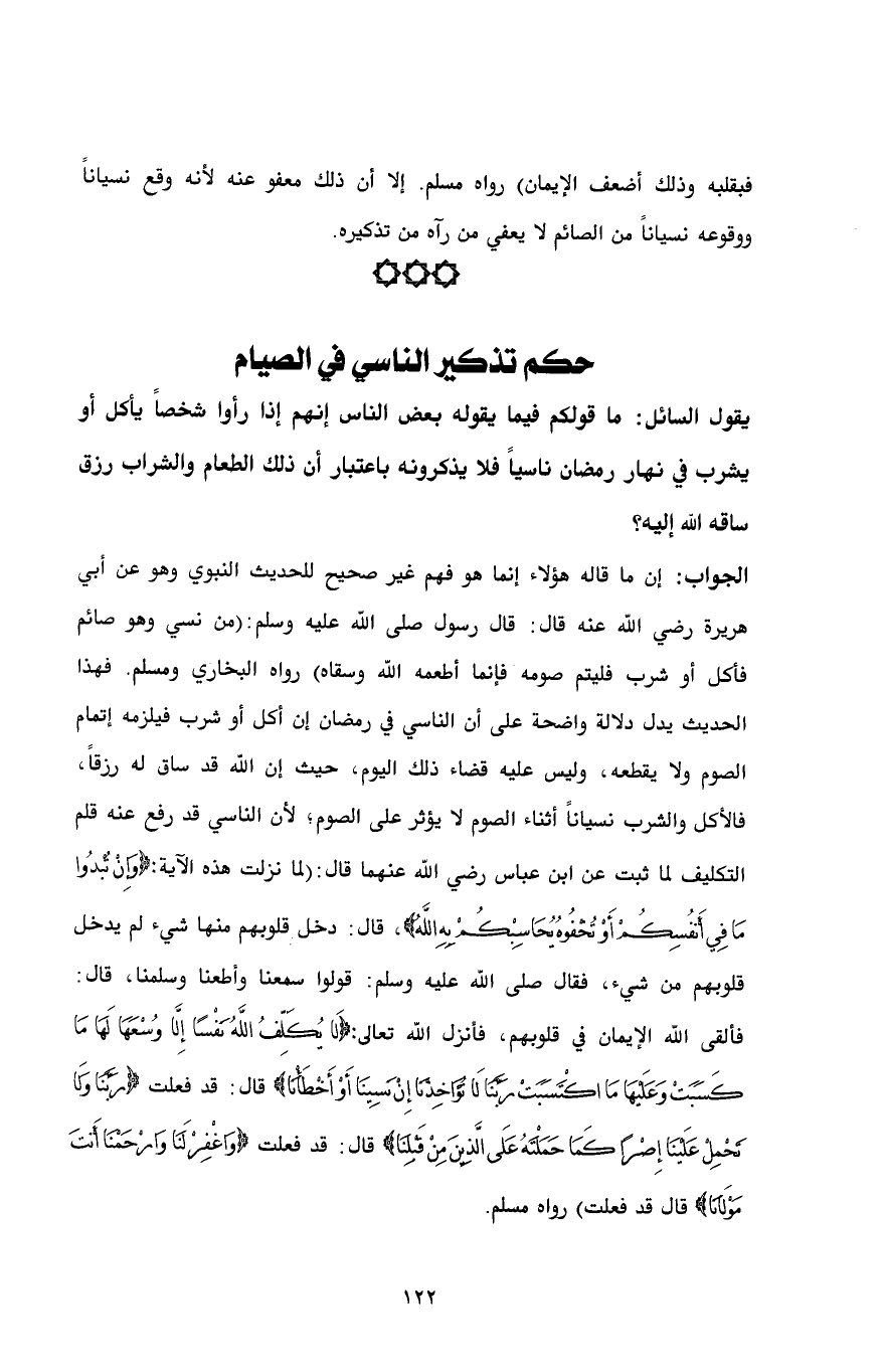 الجواب: إن ما قاله هؤلاء إنما هو فهم غير صحيح للحديث النبوي وهو عن أبي هريرة رضي الله عنه قال: قال رسول صلى الله عليه وسلم: (من نسي وهو صائم فأكل أو شرب فليتم صومه فإنما أطعمه الله وسقاه) رواه البخاري ومسلم. فهذا الحديث يدل دلالة واضحة على أن الناسي في رمضان إن أكل أو شرب فيلزمه إتمام الصوم ولا يقطعه، وليس عليه قضاء ذلك اليوم، حيث إن الله قد ساق له رزقاً، فالأكل والشرب نسياناً أثناء الصوم لا يؤثر على الصوم؛ لأن الناسي قد رفع عنه قلم التكليف لما ثبت عن ابن عباس رضي الله عنهما قال: (لما نزلت هذه الآية: {وَإِنْ تُبْدُوا مَا فِي أَنْفُسِكُمْ أَوْ تُخْفُوهُ يُحَاسِبْكُمْ بِهِ اللَّهُ}، قال: دخل قلوبهم منها شيء لم يدخل قلوبهم من شيء، فقال صلى الله عليه وسلم: قولوا سمعنا وأطعنا وسلمنا، قال: فألقى الله الإيمان في قلوبهم، فأنزل الله تعالى: {لَا يُكَلِّفُ اللَّهُ نَفْسًا إِلَّا وُسْعَهَا لَهَا مَا كَسَبَتْ وَعَلَيْهَا مَا اكْتَسَبَتْ رَبَّنَا لَا تُؤَاخِذْنَا إِنْ نَسِينَا أَوْ أَخْطَأْنَا} قال: قد فعلت {رَبَّنَا وَلَا تَحْمِلْ عَلَيْنَا إِصْرًا كَمَا حَمَلْتَهُ عَلَى الَّذِينَ مِنْ قَبْلِنَا} قال: قد فعلت {وَاغْفِرْ لَنَا وَارْحَمْنَا أَنْتَ مَوْلَانَا} قال قد فعلت) رواه مسلم.