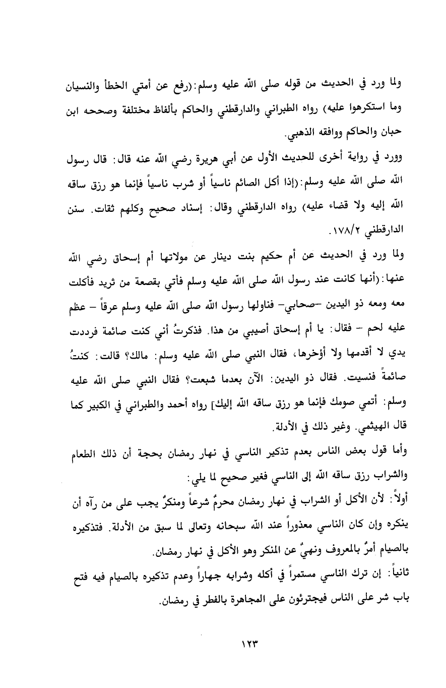 ثانياً: إن ترك الناسي مستمراً في أكله وشرابه جهاراً وعدم تذكيره بالصيام فيه فتح باب شر على الناس فيجترئون على المجاهرة بالفطر في رمضان.