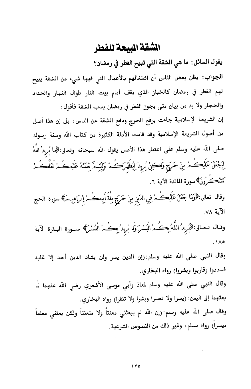 الجواب: يظن بعض الناس أن اشتغالهم بالأعمال التي فيها شيء من المشقة يبيح لهم الفطر في رمضان كالخباز الذي يقف أمام بيت النار طوال النهار والحداد والحجار ولا بد من بيان متى يجوز الفطر في رمضان بسب المشقة فأقول:
