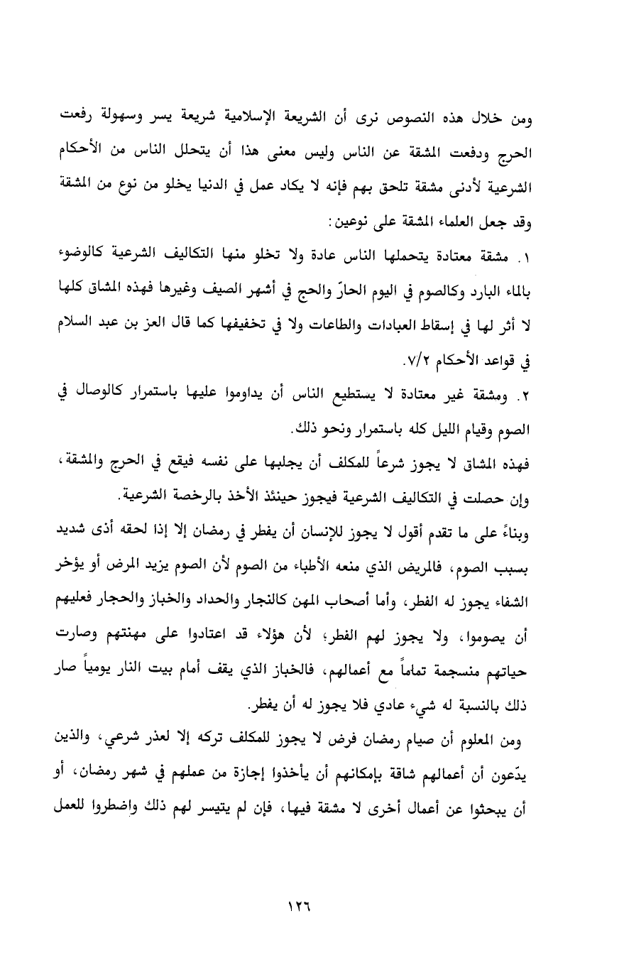 ومن خلال هذه النصوص نرى أن الشريعة الإسلامية شريعة يسر وسهولة رفعت الحرج ودفعت المشقة عن الناس وليس معنى هذا أن يتحلل الناس من الأحكام الشرعية لأدنى مشقة تلحق بهم فإنه لا يكاد عمل في الدنيا يخلو من نوع من المشقة وقد جعل العلماء المشقة على نوعين:
