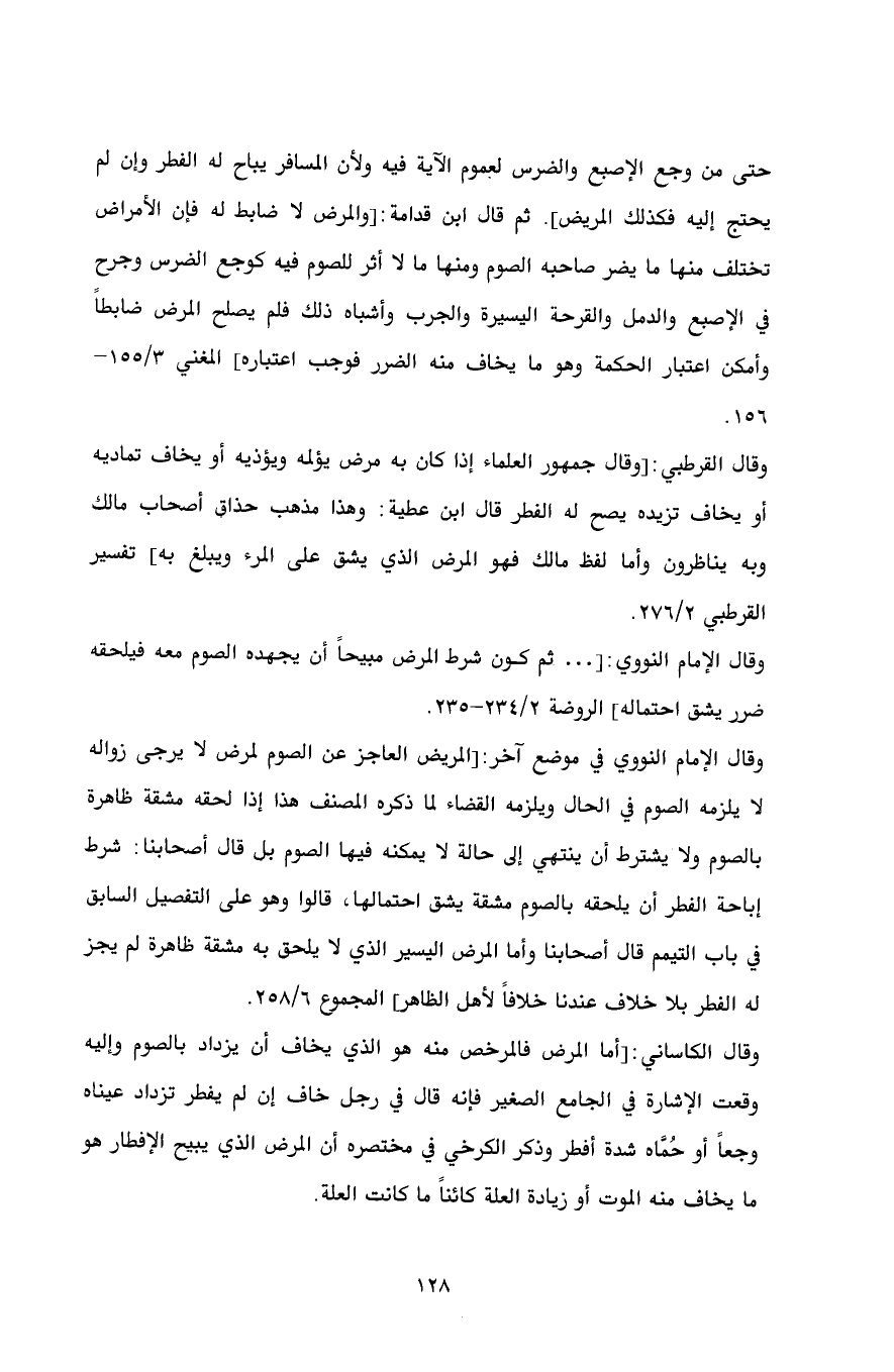وقال القرطبي: [وقال جمهور العلماء إذا كان به مرض يؤلمه ويؤذيه أو يخاف تماديه أو يخاف تزيده يصح له الفطر قال ابن عطية: وهذا مذهب حذاق أصحاب مالك وبه يناظرون وأما لفظ مالك فهو المرض الذي يشق على المرء ويبلغ به] تفسير القرطبي 2/ 276.