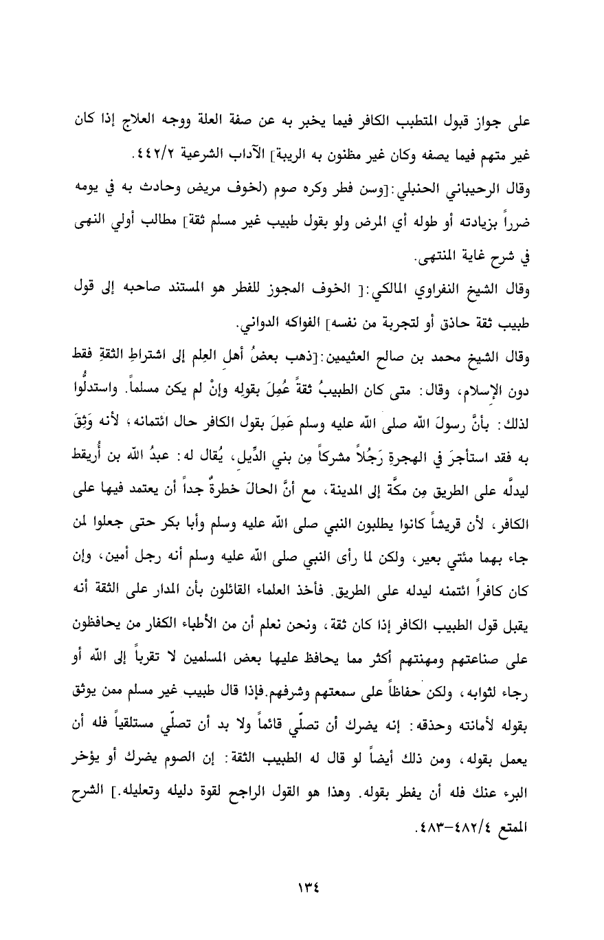 وقال الشيخ محمد بن صالح العثيمين: [ذهب بعضُ أهلِ العِلم إلى اشتراطِ الثقةِ فقط دون الإِسلام، وقال: متى كان الطبيبُ ثقةً عُمِلَ بقولِه وإنْ لم يكن مسلماً. واستدلُّوا لذلك: بأنَّ رسولَ الله صلى الله عليه وسلم عَمِلَ بقول الكافر حال ائتمانه؛ لأنه وَثِقَ به فقد استأجرَ في الهجرةِ رَجُلاً مشركاً مِن بني الدِّيلِ، يُقال له: عبدُ الله بن أُريقط ليدلَّه على الطريق مِن مكَّة إلى المدينة، مع أنَّ الحالَ خطرةٌ جداً أن يعتمد فيها على الكافر، لأن قريشاً كانوا يطلبون النبي صلى الله عليه وسلم وأبا بكر حتى جعلوا لمن جاء بهما مئتي بعير، ولكن لما رأى النبي صلى الله عليه وسلم أنه رجل أمين، وإن كان كافراً ائتمنه ليدله على الطريق. فأخذ العلماء القائلون بأن المدار على الثقة أنه يقبل قول الطبيب الكافر إذا كان ثقة، ونحن نعلم أن من الأطباء الكفار من يحافظون على صناعتهم ومهنتهم أكثر مما يحافظ عليها بعض المسلمين لا تقرباً إلى الله أو رجاء لثوابه، ولكن حفاظاً على سمعتهم وشرفهم. فإذا قال طبيب غير مسلم ممن يوثق بقوله لأمانته وحذقه: إنه يضرك أن تصلّي قائماً ولا بد أن تصلّي مستلقياً فله أن يعمل بقوله، ومن ذلك أيضاً لو قال له الطبيب الثقة: إن الصوم يضرك أو يؤخر البرء عنك فله أن يفطر بقوله. وهذا هو القول الراجح لقوة دليله وتعليله.] الشرح الممتع 4/ 482 - 483.