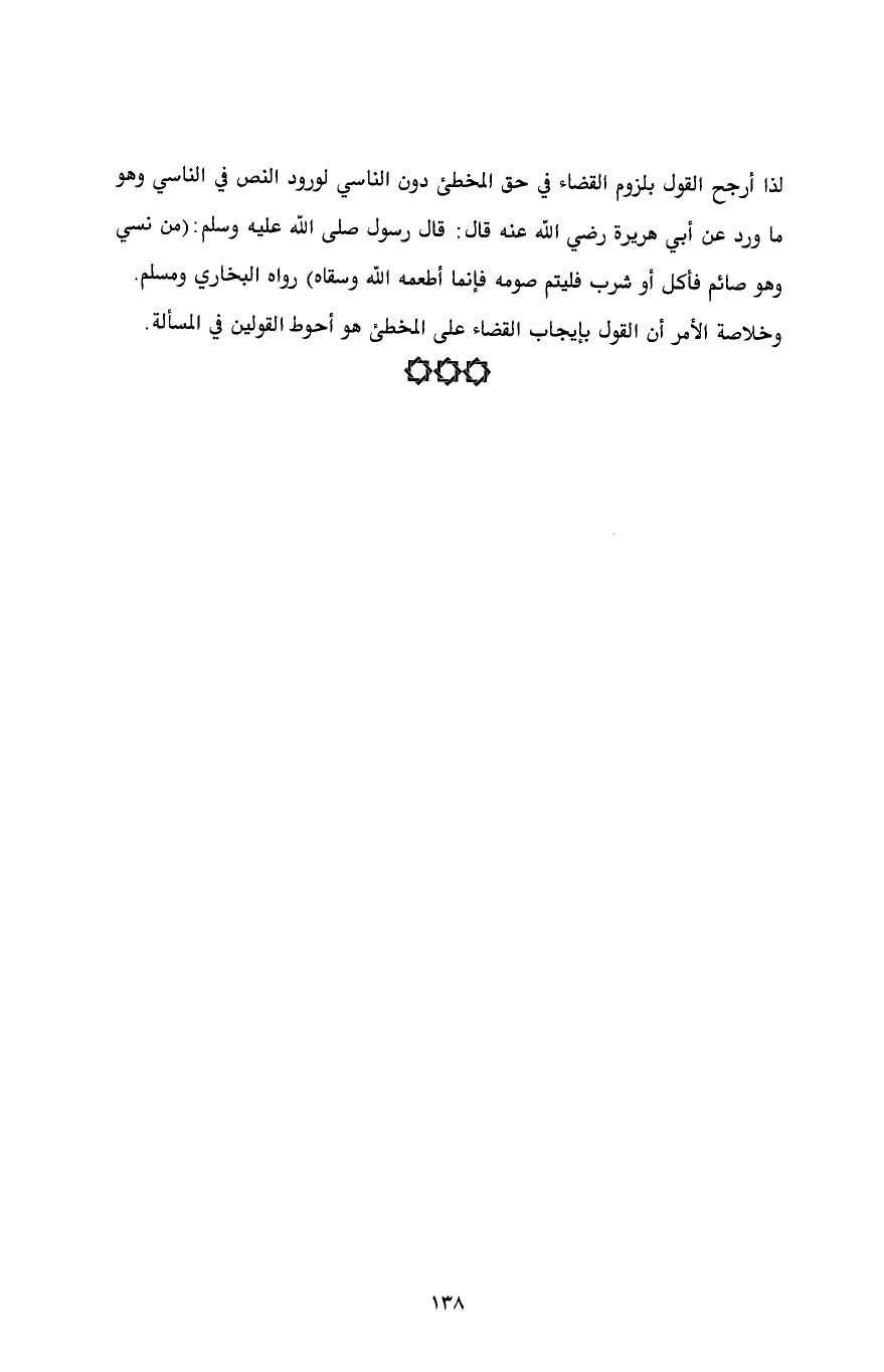 لذا أرجح القول بلزوم القضاء في حق المخطئ دون الناسي لورود النص في الناسي وهو ما ورد عن أبي هريرة رضي الله عنه قال: قال رسول صلى الله عليه وسلم: (من نسي وهو صائم فأكل أو شرب فليتم صومه فإنما أطعمه الله وسقاه) رواه البخاري ومسلم.