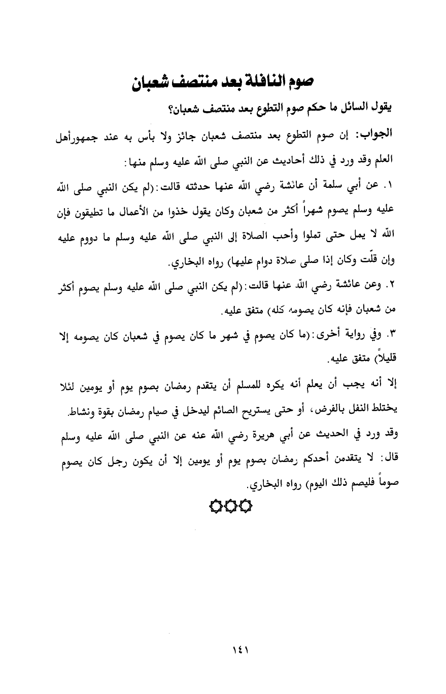 1. عن أبي سلمة أن عائشة رضي الله عنها حدثته قالت: (لم يكن النبي صلى الله عليه وسلم يصوم شهراً أكثر من شعبان وكان يقول خذوا من الأعمال ما تطيقون فإن الله لا يمل حتى تملوا وأحب الصلاة إلى النبي صلى الله عليه وسلم ما دووم عليه وإن قلّت وكان إذا صلى صلاة دوام عليها) رواه البخاري.