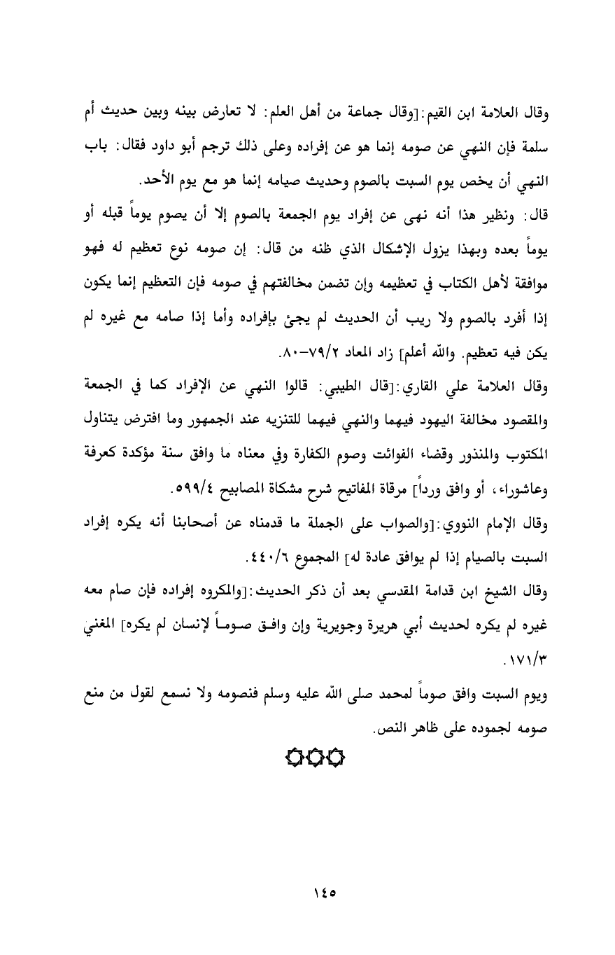 وقال العلامة ابن القيم: [وقال جماعة من أهل العلم: لا تعارض بينه وبين حديث أم سلمة فإن النهي عن صومه إنما هو عن إفراده وعلى ذلك ترجم أبو داود فقال: باب النهي أن يخص يوم السبت بالصوم وحديث صيامه إنما هو مع يوم الأحد.