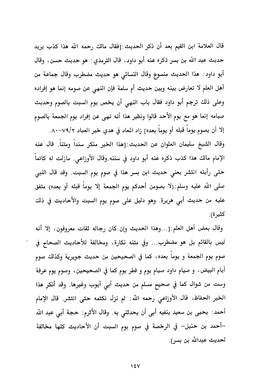 قال العلامة ابن القيم بعد أن ذكر الحديث: [فقال مالك رحمه الله هذا كذب يريد حديث عبد الله بن بسر ذكره عنه أبو داود، قال الترمذي: هو حديث حسن، وقال أبو داود: هذا الحديث منسوخ وقال النسائي هو حديث مضطرب وقال جماعة من أهل العلم لا تعارض بينه وبين حديث أم سلمة فإن النهي عن صومه إنما هو إفراده وعلى ذلك ترجم أبو داود فقال باب النهي أن يخص يوم السبت بالصوم وحديث صيامه إنما هو مع يوم الأحد قالوا ونظير هذا أنه نهى عن إفراد يوم الجمعة بالصوم إلا أن يصوم يوماً قبله أو يوماً بعده] زاد المعاد في هدي خير العباد 2/ 79 - 80.