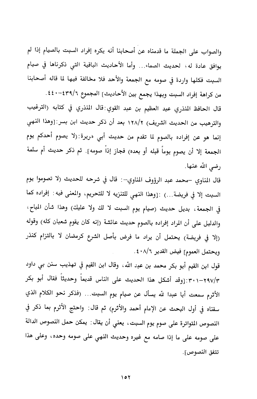 قول ابن القيم أبو بكر محمد بن عبد الله، وقال ابن القيم في تهذيب سنن بي داود 3/ 297 - 301: [وقد أشكل هذا الحديث على الناس قديماً وحديثاً فقال أبو بكر الأثرم سمعت أبا عبدا لله يسأل عن صيام يوم السبت ... (فذكر نحو الكلام الذي سقناه في أول البحث عن الإمام أحمد والأثرم) ثم قال: واحتج الأثرم بما ذكر في النصوص المتواترة على صوم يوم السبت، يعني أن يقال: يمكن حمل النصوص الدالة على صومه على ما إذا صامه مع غيره وحديث النهي على صومه وحده، وعلى هذا تتفق النصوص].