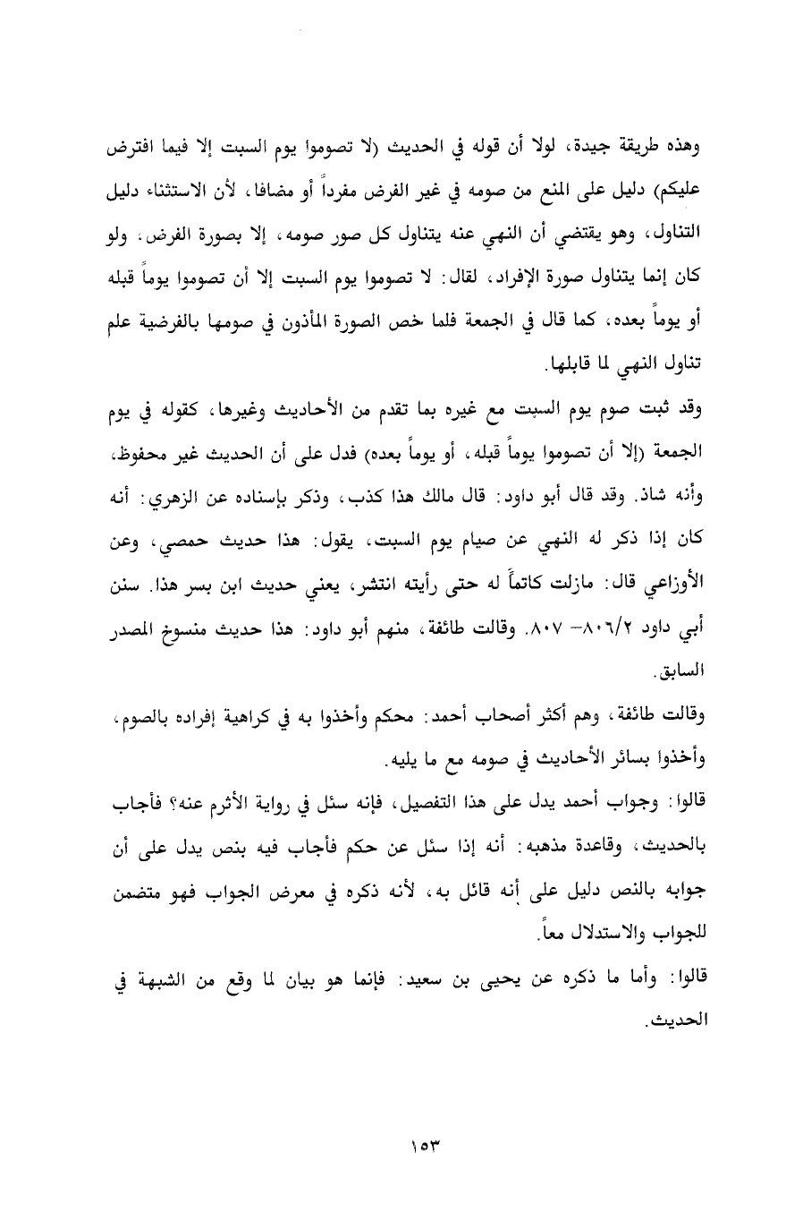 وهذه طريقة جيدة، لولا أن قوله في الحديث (لا تصوموا يوم السبت إلا فيما افترض عليكم) دليل على المنع من صومه في غير الفرض مفرداً أو مضافا، لأن الاستثناء دليل التناول، وهو يقتضي أن النهي عنه يتناول كل صور صومه، إلا بصورة الفرض، ولو كان إنما يتناول صورة الإفراد، لقال: لا تصوموا يوم السبت إلا أن تصوموا يوماً قبله أو يوماً بعده، كما قال في الجمعة فلما خص الصورة المأذون في صومها بالفرضية علم تناول النهي لما قابلها.