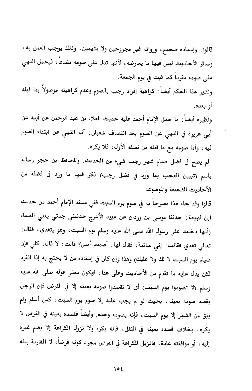 قالوا وقد جاء هذا مصرحاً به في صوم يوم السبت ففي مسند الإمام أحمد من حديث ابن لهيعة: حدثنا موسى بن وردان عن عبيد الأعرج حدثتني جدتي يعني الصماء (أنها دخلت على رسول الله صلى الله عليه وسلم يوم السبت، وهو يتغدى، فقال: تعالي تغدي فقالت: إني صائمة، فقال لها: أصمت أمس؟ قالت: لا قال: كلي فإن صيام يوم السبت لا لك ولا عليك) وهذا وإن كان في إسناده من لا يحتج به إذا انفرد لكن يدل عليه ما تقدم من الأحاديث وعلى هذا: فيكون معنى قوله صلى الله عليه وسلم: (لا تصوموا يوم السبت) أي لا تقصدوا صومه بعينه إلا في الفرض فإن الرجل يقصد صومه بعينه، بحيث لو لم يجب عليه إلا صوم يوم السبت، كمن أسلم ولم يبق من الشهر إلا يوم السبت، فإنه يصومه وحده. وأيضاً فقصده بعينه في الفرض لا يكره، بخلاف قصده بعينه في النفل، فإنه يكره ولا تزول الكراهة إلا بضم غيره إليه، أو موافقته عادة، فالمزيل للكراهة في الفرض مجرد كونه فرضاً، لا المقارنة بينه