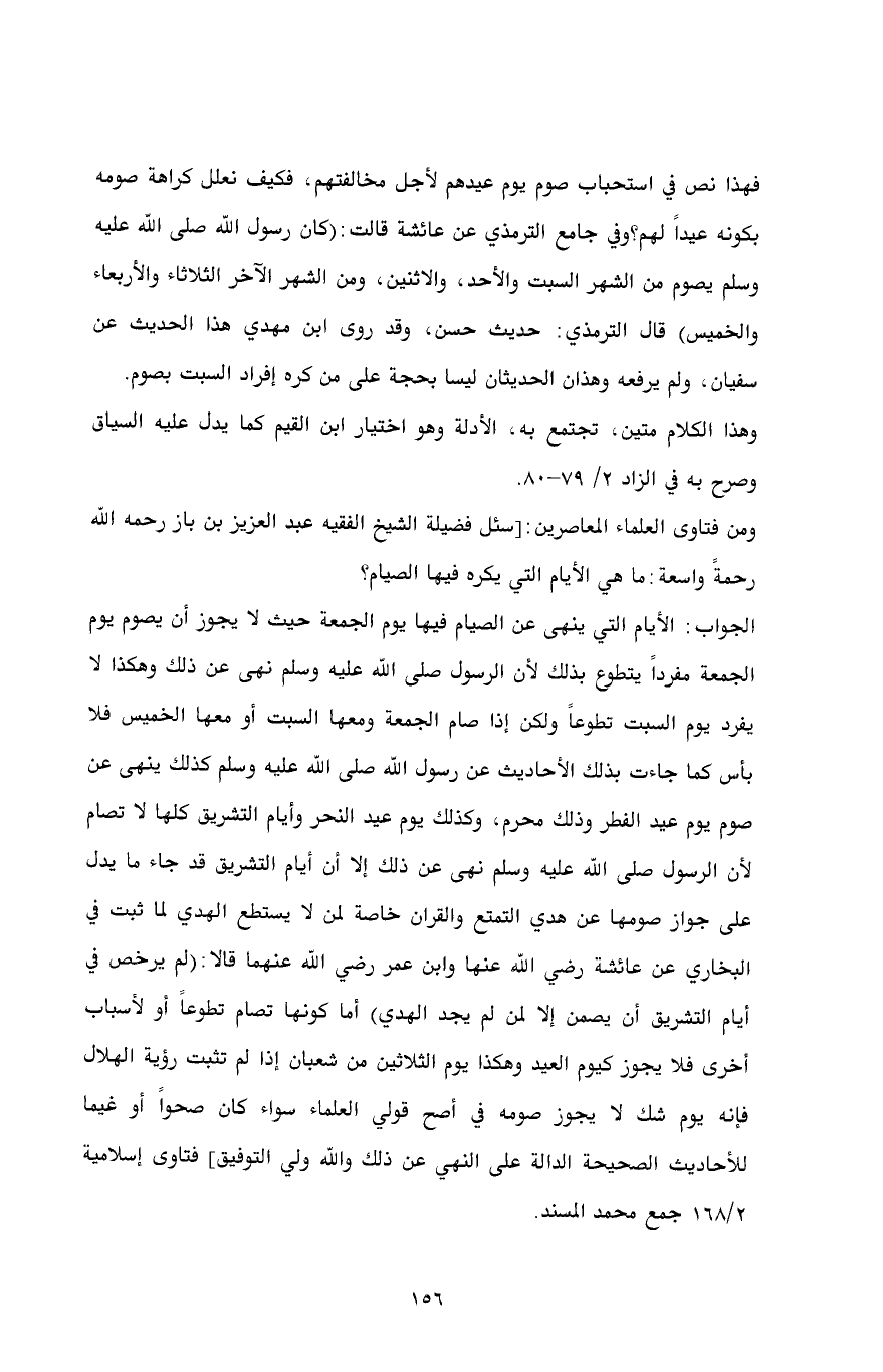 فهذا نص في استحباب صوم يوم عيدهم لأجل مخالفتهم، فكيف نعلل كراهة صومه بكونه عيداً لهم؟ وفي جامع الترمذي عن عائشة قالت: (كان رسول الله صلى الله عليه وسلم يصوم من الشهر السبت والأحد، والاثنين، ومن الشهر الآخر الثلاثاء والأربعاء والخميس) قال الترمذي: حديث حسن، وقد روى ابن مهدي هذا الحديث عن سفيان، ولم يرفعه وهذان الحديثان ليسا بحجة على من كره إفراد السبت بصوم.