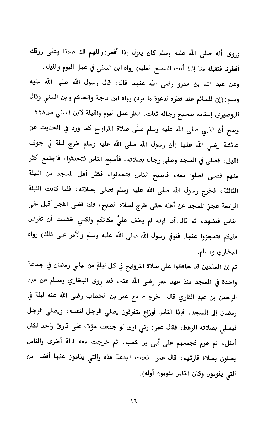 وصح أن النبي صلى الله عليه وسلم صلَّى صلاة التراويح كما ورد في الحديث عن عائشة رضي الله عنها (أن رسول الله صلى الله عليه وسلم خرج ليلة في جوف الليل، فصلى في المسجد وصلى رجال بصلاته، فأصبح الناس فتحدثوا، فاجتمع أكثر منهم فصلى فصلوا معه، فأصبح الناس فتحدثوا، فكثر أهل المسجد من الليلة الثالثة، فخرج رسول الله صلى الله عليه وسلم فصلى بصلاته، فلما كانت الليلة الرابعة عجز المسجد عن أهله حتى خرج لصلاة الصبح، فلما قضى الفجر أقبل على الناس فتشهد، ثم قال: أما فإنه لم يخف عليَّ مكانكم ولكني خشيت أن تفرض عليكم فتعجزوا عنها. فتوفي رسول الله صلى الله عليه وسلم والأمر على ذلك) رواه البخاري ومسلم.