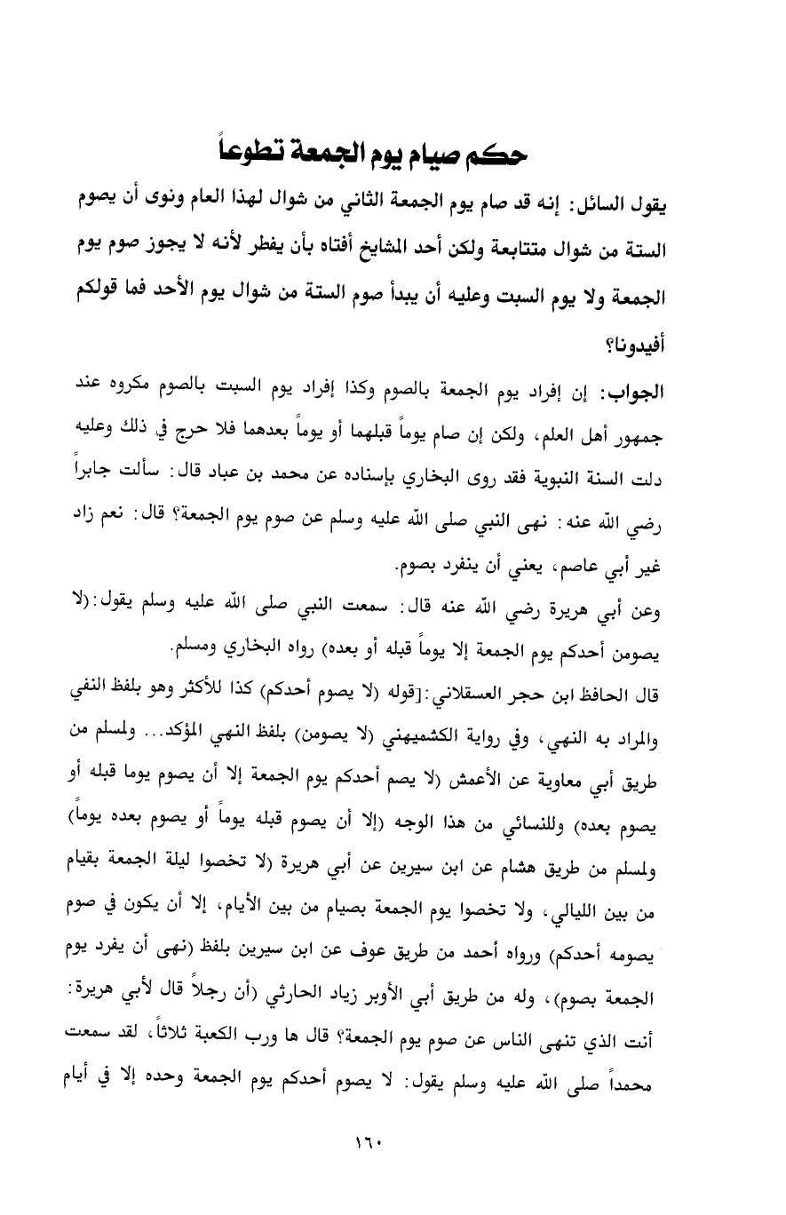 يقول السائل: إنه قد صام يوم الجمعة الثاني من شوال لهذا العام ونوى أن يصوم الستة من شوال متتابعة ولكن أحد المشايخ أفتاه بأن يفطر لأنه لا يجوز صوم يوم الجمعة ولا يوم السبت وعليه أن يبدأ صوم الستة من شوال يوم الأحد فما قولكم أفيدونا؟