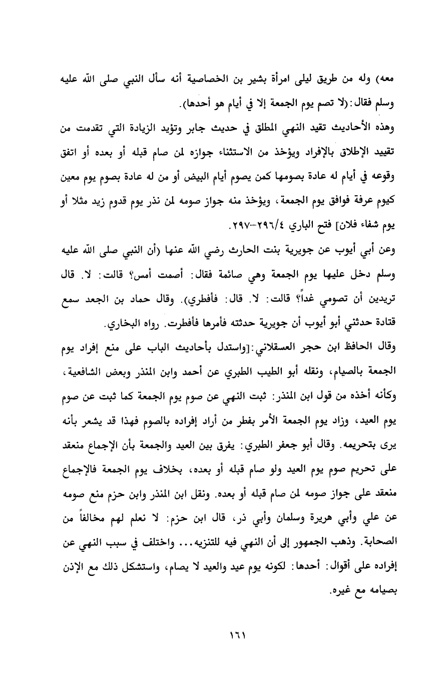 وهذه الأحاديث تقيد النهي المطلق في حديث جابر وتؤيد الزيادة التي تقدمت من تقييد الإطلاق بالإفراد ويؤخذ من الاستثناء جوازه لمن صام قبله أو بعده أو اتفق وقوعه في أيام له عادة بصومها كمن يصوم أيام البيض أو من له عادة بصوم يوم معين كيوم عرفة فوافق يوم الجمعة، ويؤخذ منه جواز صومه لمن نذر يوم قدوم زيد مثلا أو يوم شفاء فلان] فتح الباري 4/ 296 - 297.