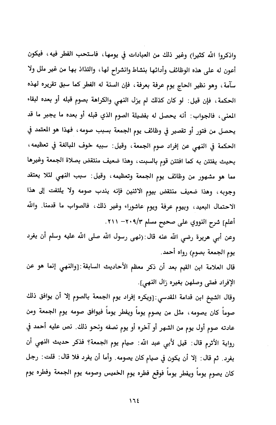 واذكروا الله كثيرا) وغير ذلك من العبادات في يومها، فاستحب الفطر فيه، فيكون أعون له على هذه الوظائف وأدائها بنشاط وانشراح لها، والتذاذ بها من غير ملل ولا سآمة، وهو نظير الحاج يوم عرفة بعرفة، فإن السنة له الفطر كما سبق تقريره لهذه الحكمة، فإن قيل: لو كان كذلك لم يزل النهي والكراهة بصوم قبله أو بعده لبقاء المعنى، فالجواب: أنه يحصل له بفضيلة الصوم الذي قبله أو بعده ما يجبر ما قد يحصل من فتور أو تقصير في وظائف يوم الجمعة بسبب صومه، فهذا هو المعتمد في الحكمة في النهي عن إفراد صوم الجمعة، وقيل: سببه خوف المبالغة في تعظيمه، بحيث يفتتن به كما افتتن قوم بالسبت، وهذا ضعيف منتقض بصلاة الجمعة وغيرها مما هو مشهور من وظائف يوم الجمعة وتعظيمه، وقيل: سبب النهي لئلا يعتقد وجوبه، وهذا ضعيف منتقض بيوم الاثنين فإنه يندب صومه ولا يلتفت إلى هذا الاحتمال البعيد، وبيوم عرفة ويوم عاشوراء وغير ذلك، فالصواب ما قدمنا. والله أعلم] شرح النووي على صحيح مسلم 3/ 209 - 211.