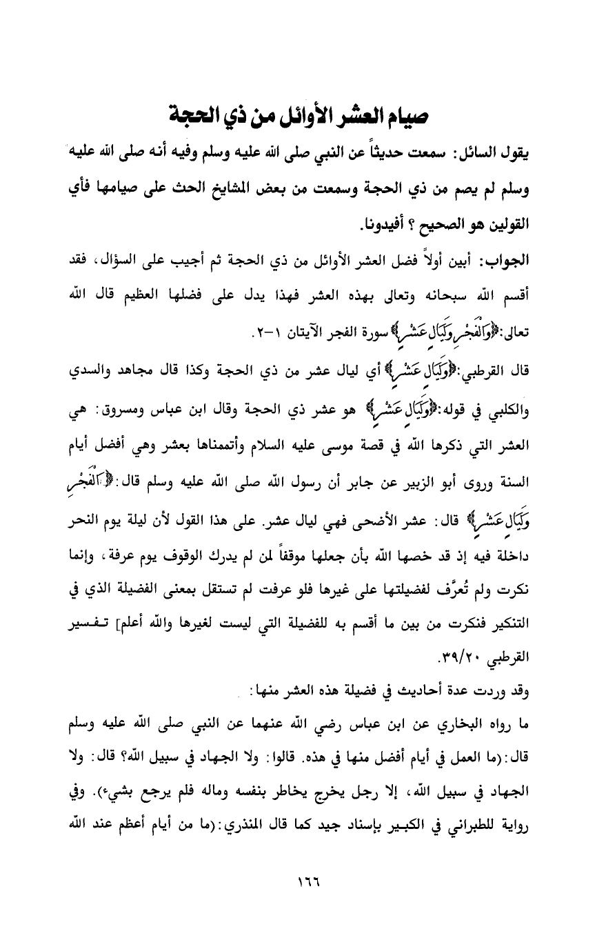 الجواب: أبين أولاً فضل العشر الأوائل من ذي الحجة ثم أجيب على السؤال، فقد أقسم الله سبحانه وتعالى بهذه العشر فهذا يدل على فضلها العظيم قال الله تعالى: {وَالْفَجْرِ وَلَيَالٍ عَشْرٍ} سورة الفجر الآيتان 1 - 2.