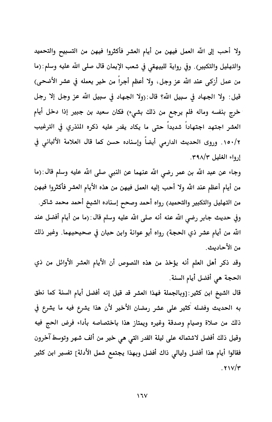 ولا أحب إلى الله العمل فيهن من أيام العشر فأكثروا فيهن من التسبيح والتحميد والتهليل والتكبير). وفي رواية للبيهقي في شعب الإيمان قال صلى الله عليه وسلم: (ما من عمل أزكى عند الله عز وجل، ولا أعظم أجراً من خير يعمله في عشر الأضحى) قيل: ولا الجهاد في سبيل الله؟ قال: (ولا الجهاد في سبيل الله عز وجل إلا رجل خرج بنفسه وماله فلم يرجع من ذلك بشيء) فكان سعيد بن جبير إذا دخل أيام العشر اجتهد اجتهاداً شديداً حتى ما يكاد يقدر عليه ذكره المنذري في الترغيب 2/ 150. وروى الحديث الدارمي أيضاً وإسناده حسن كما قال العلامة الألباني في إرواء الغليل 3/ 398.