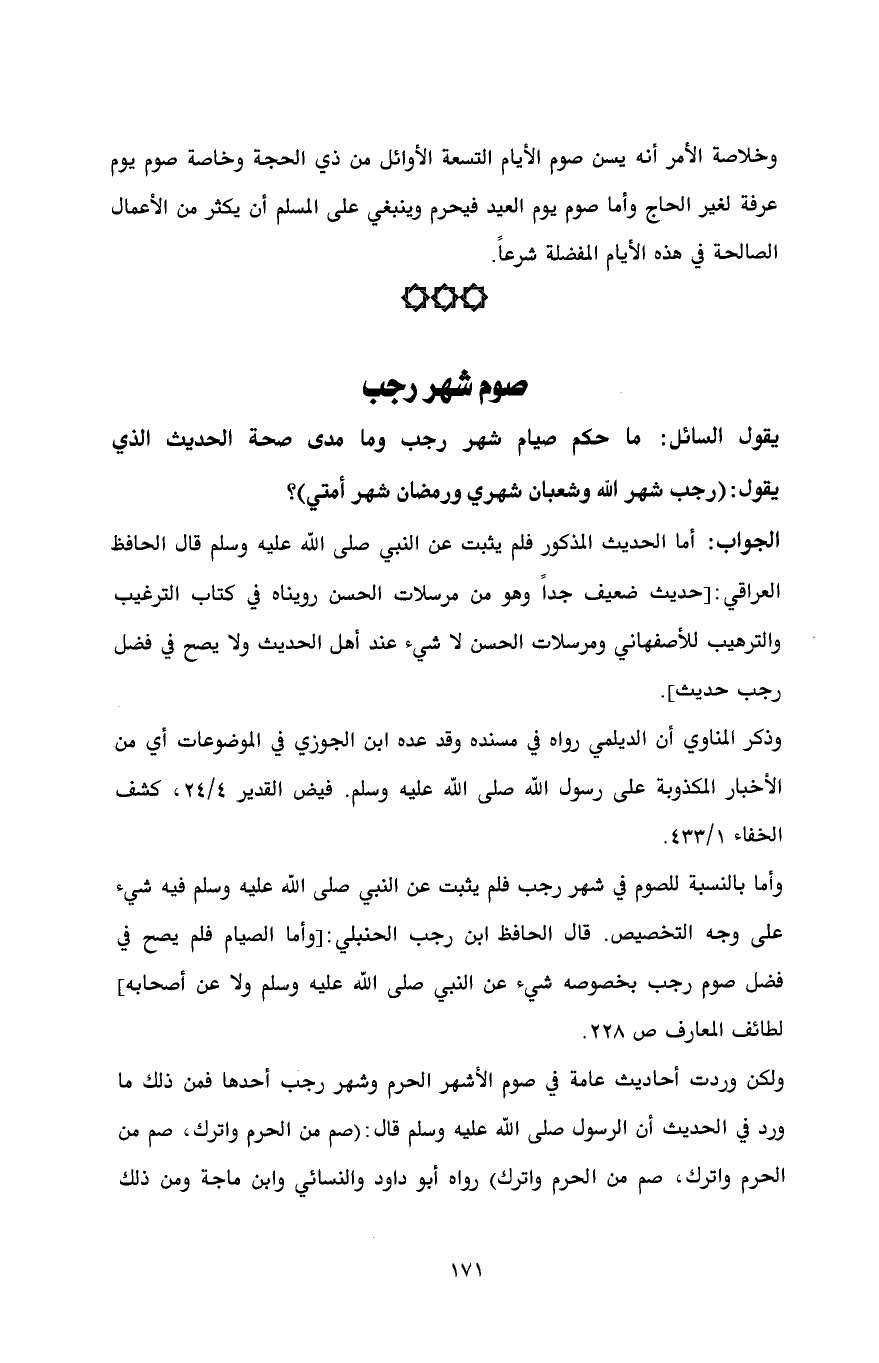 وأما بالنسبة للصوم في شهر رجب فلم يثبت عن النبي صلى الله عليه وسلم فيه شيء على وجه التخصيص. قال الحافظ ابن رجب الحنبلي: [وأما الصيام فلم يصح في فضل صوم رجب بخصوصه شيء عن النبي صلى الله عليه وسلم ولا عن أصحابه] لطائف المعارف ص 228.